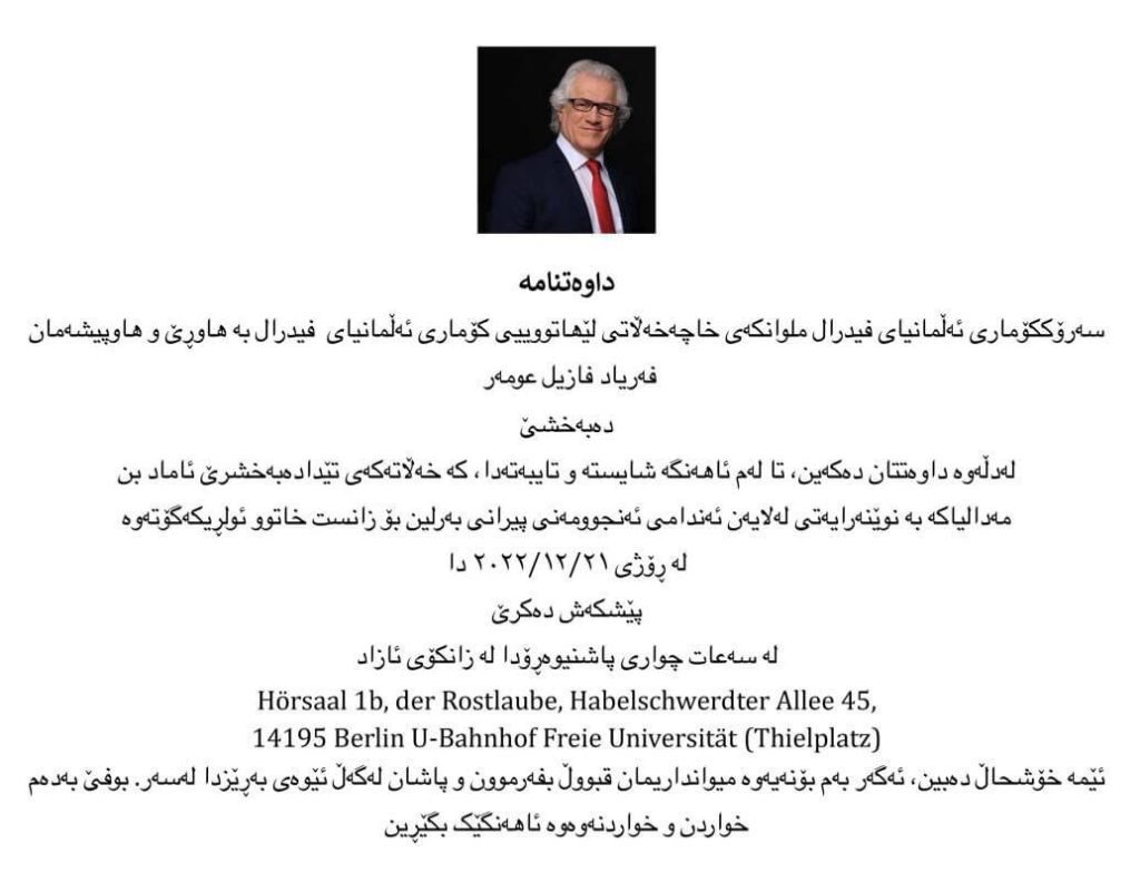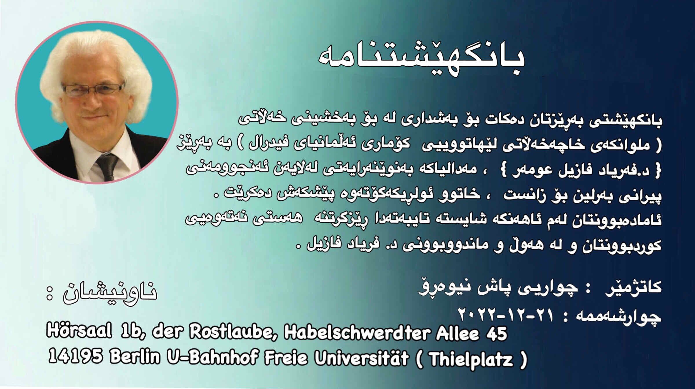 Hêjayî gotinê ye ku Navenda Rewanda Kurdistan-Berlîn bang li Kurdên sirgûnî bi giştî û Almanyayê bi taybetî dike ku di rêûresmeke diyarkirî ya xelatê de beşdarî merasîmê bibin, da kû em bi germî pîrozbayî li Dr. Faryad Fazil Omer bikin ku wek Kurd xelateke bi vî rengî wergirtiye