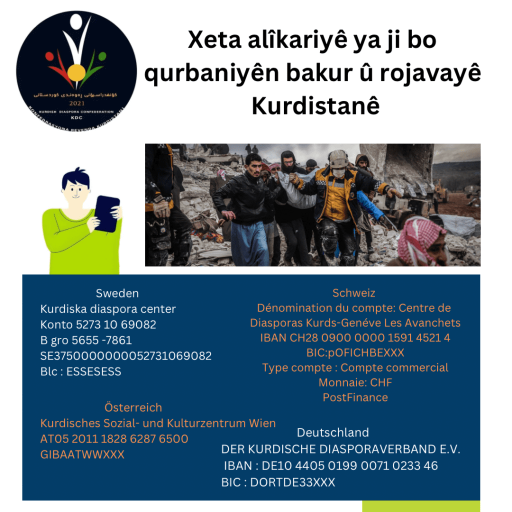 Konfederesyona rewanda Kurdistanê daxwaz ji Kurdên xerîb û mirovatî li seranserî cîhanê dike ku bi hemû hêza xwe karê xwe bikin weke erkekî niştimanî û hevxemiya qurbaniyên karesata erdhejê li bakûr û rojavayê Kurdistanê. Jimarên bankên jêrîn wê alîkariya xwe radestî navenda rewanda Kurdistanê bikin, lê em ê karibin hin êşên ku bi serê xwişk û birayên me hatine kêm bikin û hêviya xwe ji bo pêşeroja qurbaniyan bidin