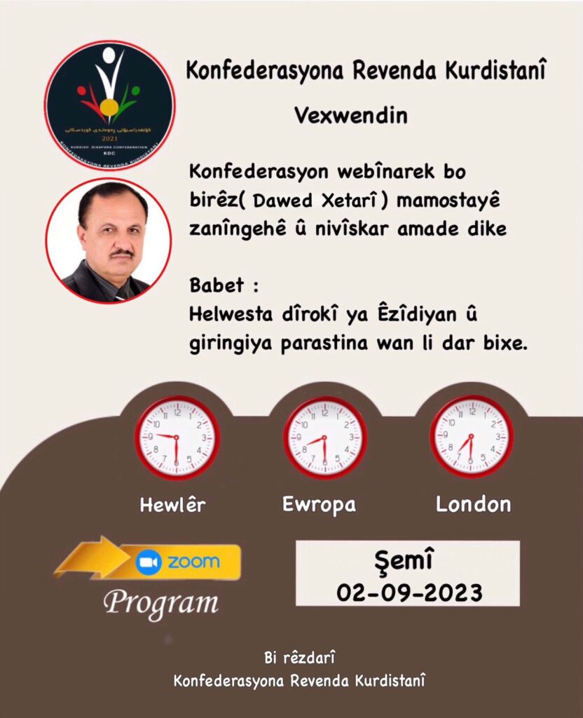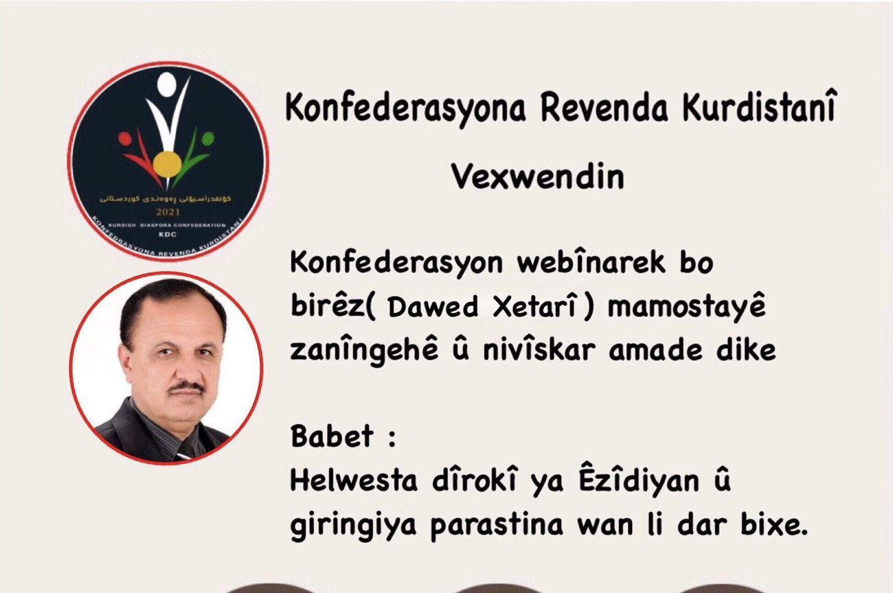 Konfederasyona Rewenda Kurdistanî bi rêya bernameya Zoomê re webînarek bo Nivîskar ( Dawed Xetarî) mamostayê zanîngehê li dar xistin bi navê Helwesta dîrokî ya Êzîdiyan û giringiya parastina wan .
