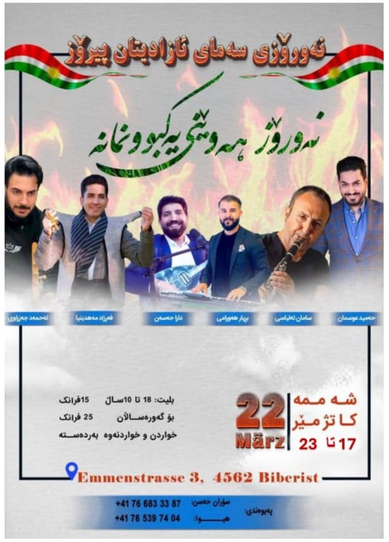 Bi helkefta cejna NEWROZ ê, sembola azadî, aramî û yekbûnê bi beşdarbûna van honermendan: ( Dara se’don , Ehmed Cezrawî , Hemîd Osman , Saman Elyasî , Biryar Hewramî û Ferzad Mehdînya ) li roja şemiyê: 22.03.2025