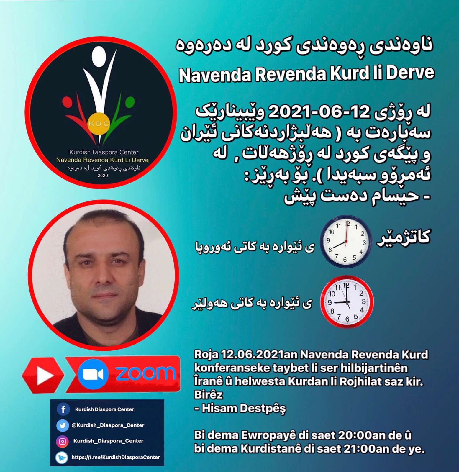 konferanseke taybet 07/06/202107/06/2021169 Roja 12.06.2021an Navenda Revenda Kurd konferanseke taybet li ser hilbijartinên Îranê û helwesta Kurdan li Rojhilat saz kir. Birêz- Hisam DestpêşBi dema Ewropayê di saet 20:00an de û bi dema Kurdistanê di saet 21:00an de ye.