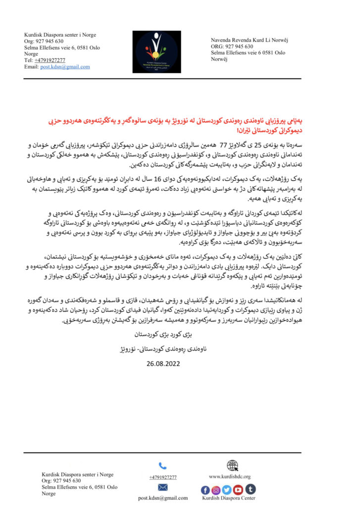 Navenda rewanda Kurdistanî-Norwêcê bi helkefta salveger û yekxistina her du aliyên demokratên Kurdistanê peyameke pîrozbayî weşand û ji bilî pîroz bayî kirina wan jî ku niha kurd ji her demê zêdetir pêdiviya wan bi yekrêzî û pêkvejiyanê heye