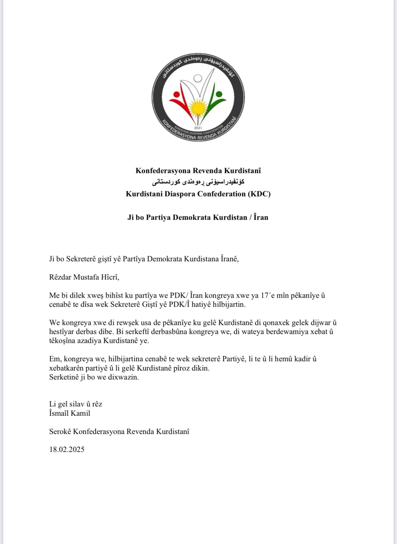 Me bi dilek xweş bihîst ku partîya we PDK/ Îran kongreya xwe ya 17´