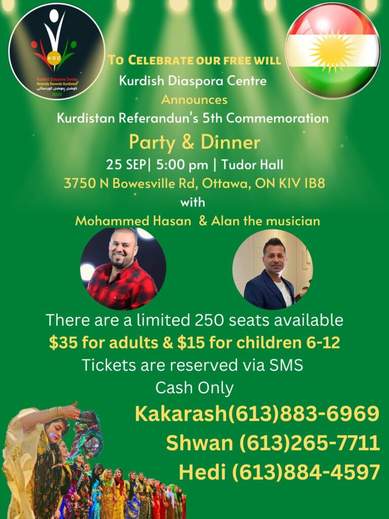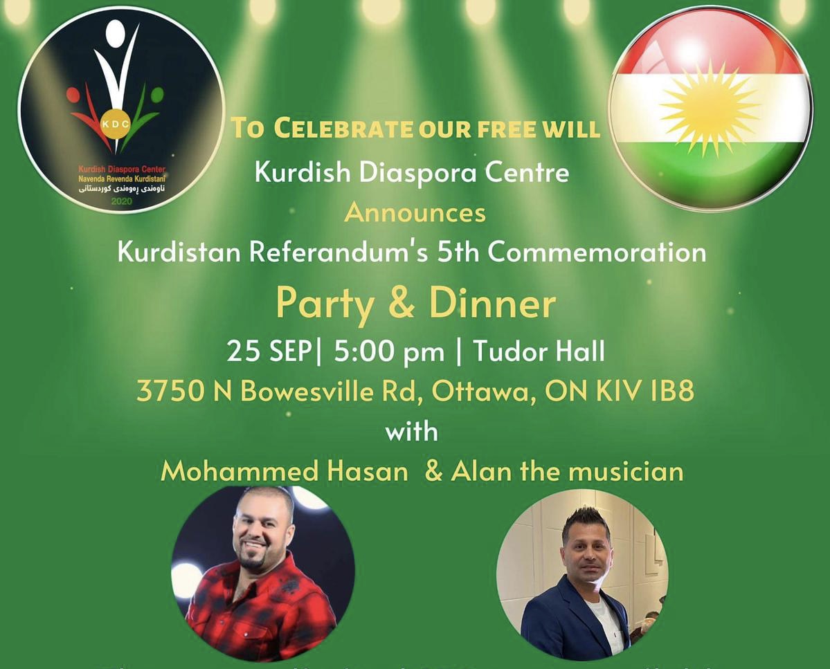 لەساڵیادی ڕیفراندۆمی خەڵکی کوردستان ناوەندی ڕەوەندی کوردستانی لە کەنەدا لەشاری ئۆتاوا ئاهەنگێکی کراوەی خێزانی بەشداری چەند هونەرمەندێک سازدەکات