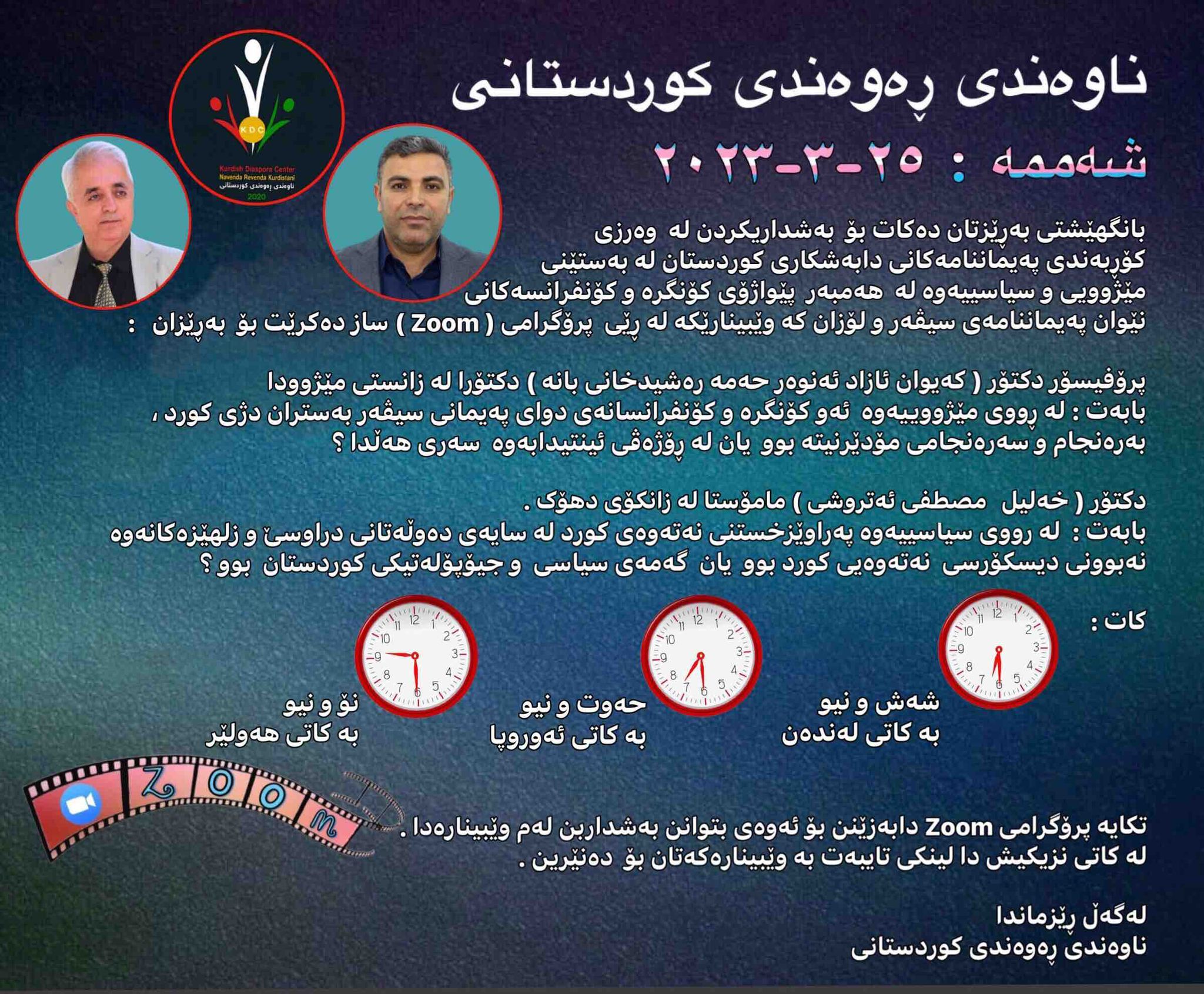 بانگهێشتی بەڕێزتان دەکات بۆ بەشداریکردن لە وەرزی کۆڕبەندی پەیماننامەکانی دابەشکاری کوردستان لە بەستێنی مێژوویی و سیاسییەوە لە هەمبەر پێواژۆی کۆنگرە و کۆنفرانسەکانی نێوان پەیماننامەی سیڤەر و لۆزان کە وێبینارێکە لە ڕێی پرۆگرامیZoom بۆ ئەم بەڕێزان ساز دەکرێت: