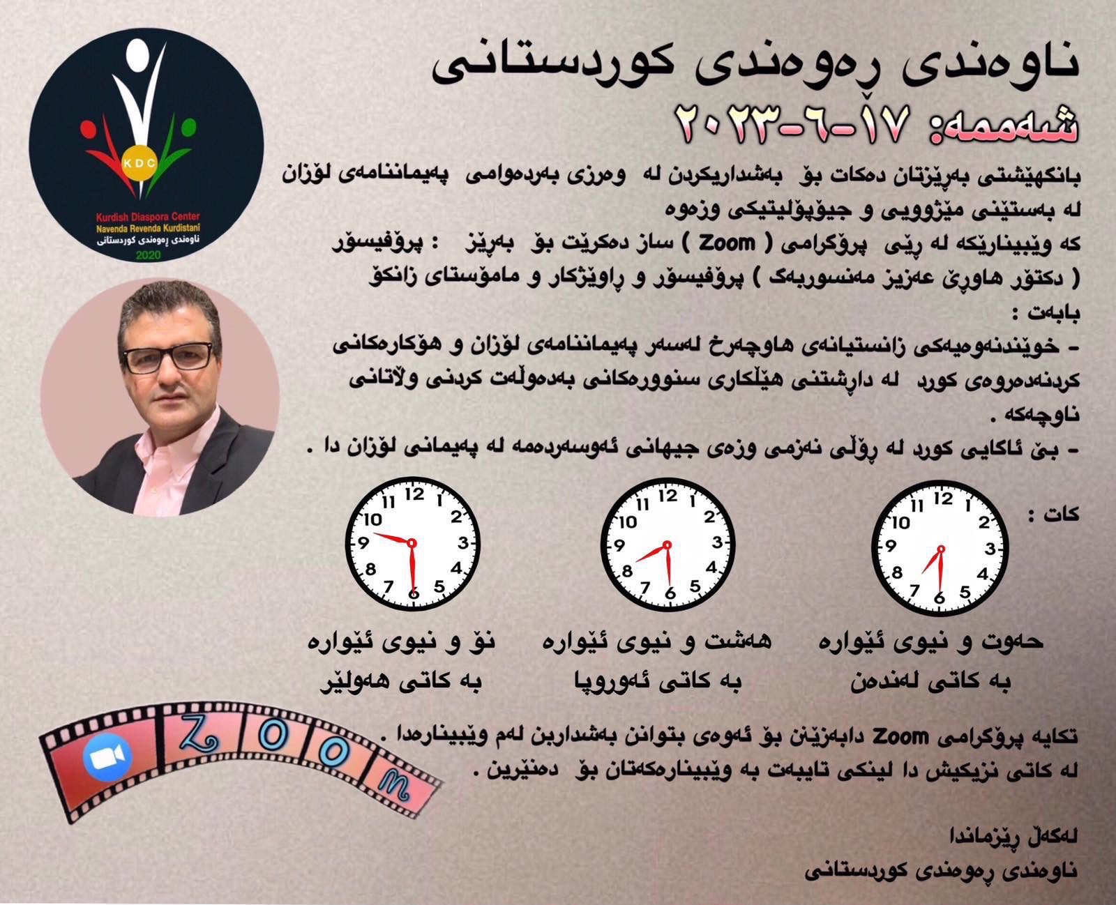 بانگهێشتی بەڕێزتان دەکات بۆ بەشداریکردن لە وەرزی بەردەوامی پەیماننامەی لۆزان لە بەستێنی مێژوویی و جیۆپۆلیتیکی وزەوە، ئەوەش لە وێبینارێکدا بە ڕێی پرۆگرامی Zoom بۆ بەڕێز: پرۆفیسۆر دکتۆر هاوڕێ عەزیز مەنسوربەگ، پرۆفیسۆر و ڕاوێژکار و مامۆستای زانکۆ، ساز دەکرێت.