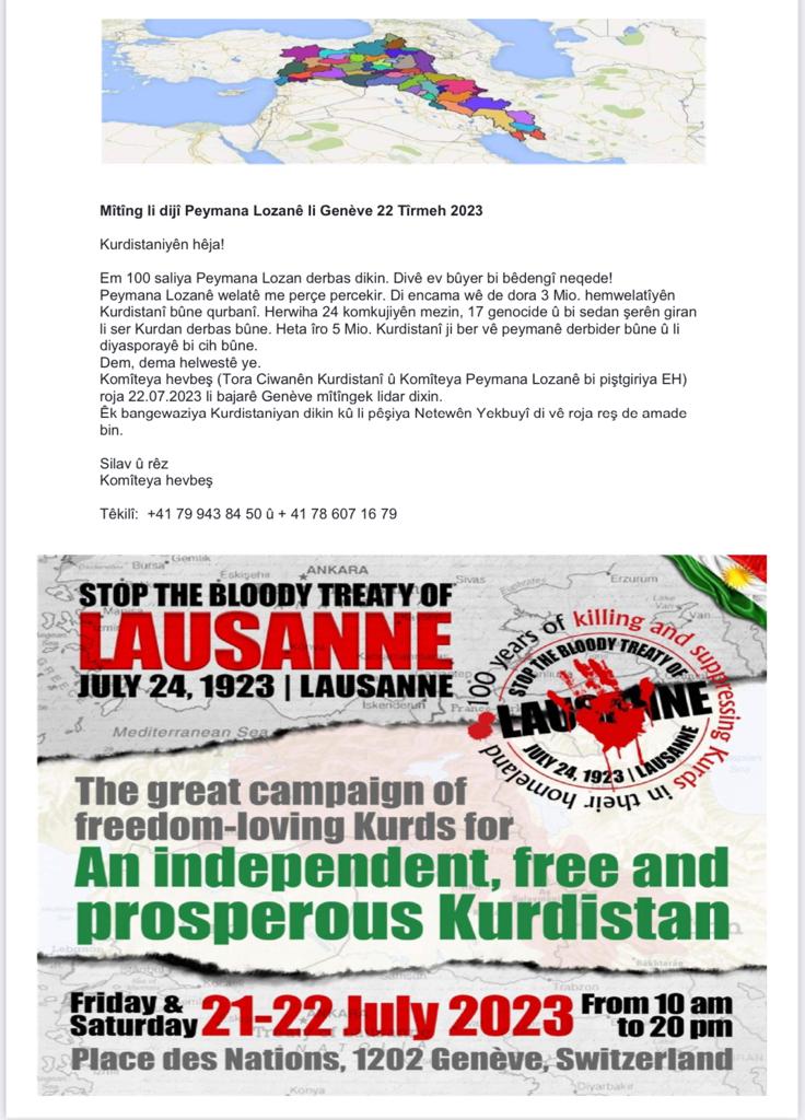 جێی باسە، ئەوان بانگەوازیان بۆ ئەو گردبوونەوە کردووە و، لە بەشێکی بانگەوازەکەیاندا هاتووە، پەیماننامەی لۆزان، وڵاتی ئێمەیان پارچە پارچە کرد و، بەو هۆییەوە سێ ملیۆن هاوڵاتی کوردستان بوونەتە قوربانی، هەروەها 24 کۆمەڵکوژی گەورە و 17 جینۆساید و سەدان شەڕی قورس بەسەر کورددا هاتوون، تا ئێستا 5 ملیۆن کورد، بە هۆی ئەم ڕێککەوتنەوە دەربەدەر کراون.