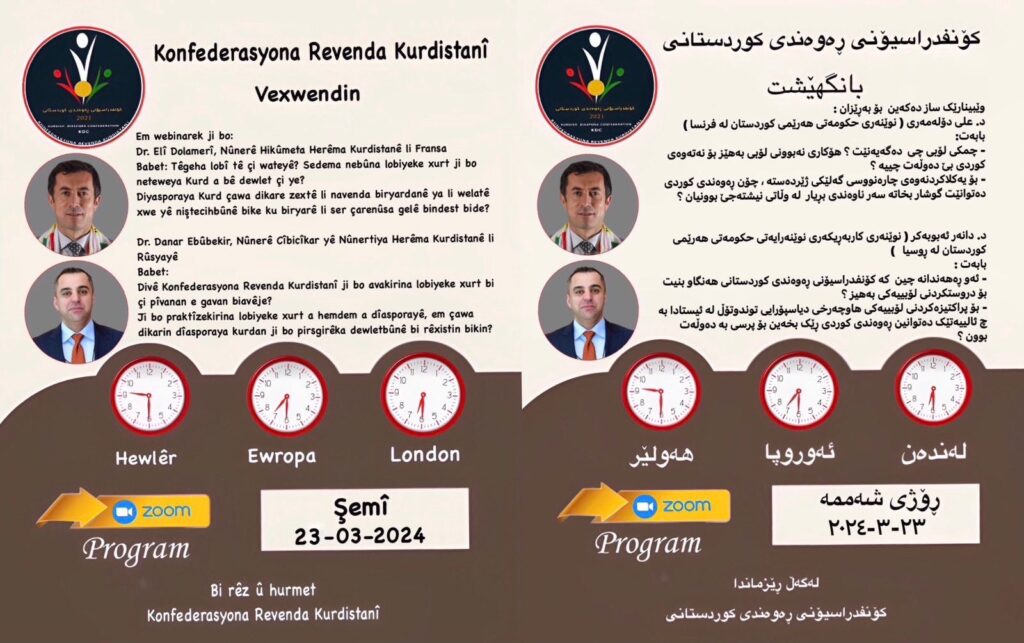 بەشی ڕاگەیاندنی کۆنفدراسیۆنی ڕەوەندی کوردستانی، شەوی شەممە وێبنارێک لە ڕێی بەرنامەی زوومەوە بۆ دوو نوێنەری دەرەوەی حکومەتی هەرێمی کوردستان لەسەر پرسی لۆبی کردن سازدەکات.