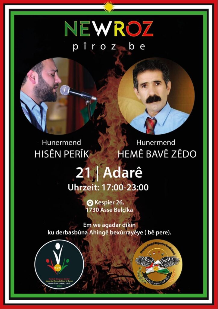 کاتژمێر 5ی ئێوارەی 21ی3ی2024، ناوەندی ڕەوەندی کوردستانی-بەلجیکا، بە هاوکاری بزووتنەوەی دەنگی ڕزگاریخوازی کوردستان لە بەلجیکا، بەبۆنەی جەژن و سەری ساڵی نوێی کوردی و بە ئامادەبوونی هەردوو هونەرمەندی کورد (حسێن پێریک، حەمە باڤێ زێدۆ) ئاهەنگێکی ناوازە ساز دەکەن.