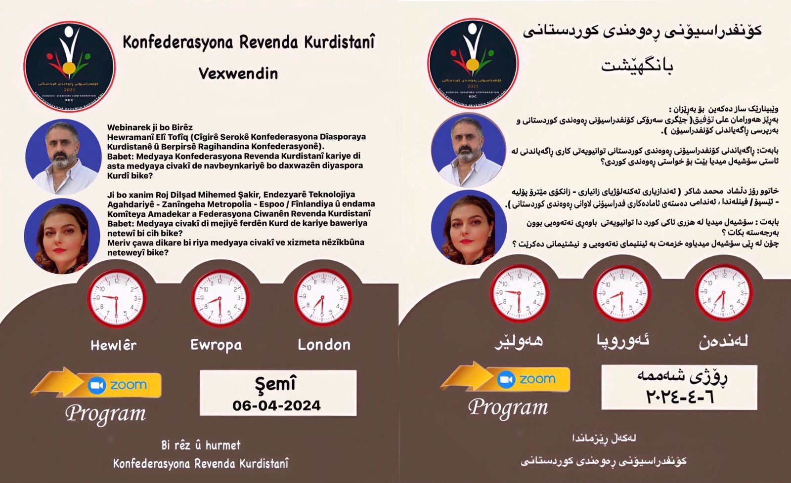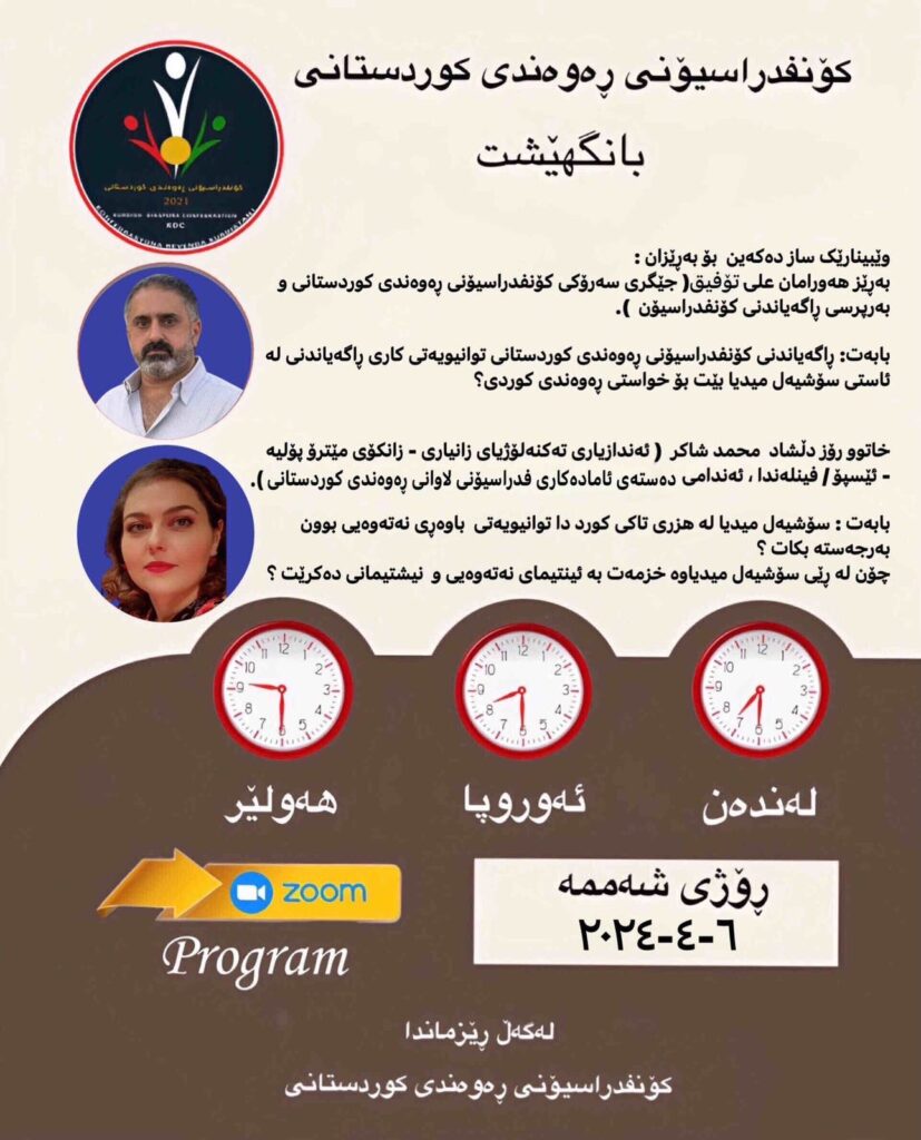 ڕاگەیاندنی کۆنفدراسیۆن وێبنیارێک بۆ هەر یەکە لە هەورامان عەلی تۆفیق جێگری سەرۆکی کۆنفدراسیۆنی ڕەوەندی کوردستانی و خاتوو ڕۆز دڵشاد ئەندازیاری تەکنەلۆژیای زنیاری ساز دەکەن، کە تایبەتە بە کاریگەری سۆشیال میدیالەسەر ئینتیمای نیشتمانی.