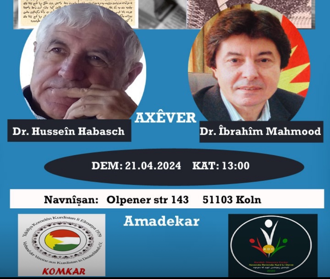 ڕۆژی یەکشەممە کاتژمێر 13:00، ڕێکەوتی ٢١ی٤ی٢٠٢٤، ناوەندی ڕەوەندی کوردستانی-دوسلدۆرف بە هاوکاری کۆمکار، بە بۆنەی ڕۆژی ڕۆژنامەگەری کوردی، سیمینارێک بۆ دکتۆر حوسێن هاباش و دکتۆر ئیبراهیم مەحمود ڕێکدەخەن