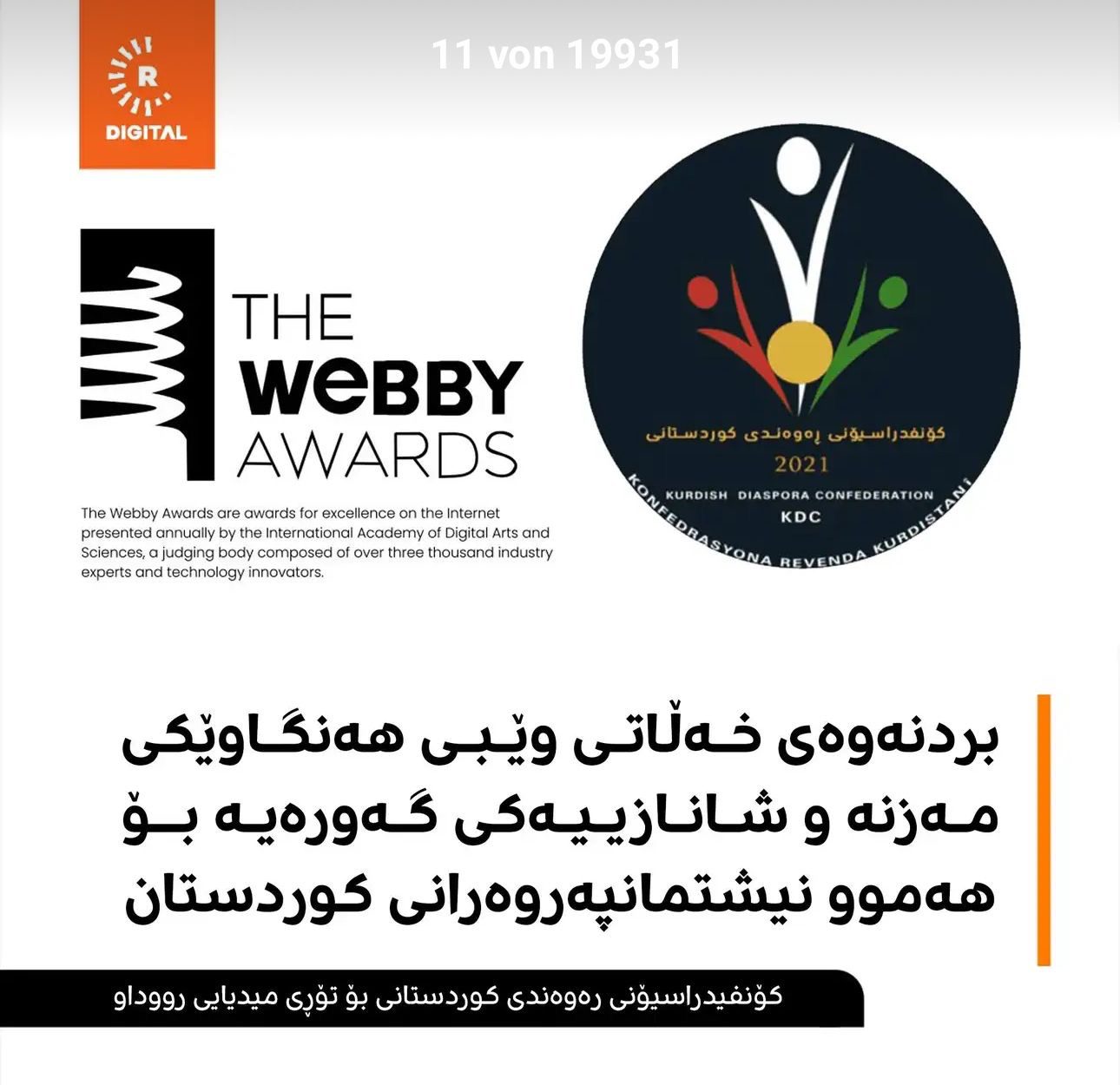 شەرەفمەندین بە ناوی کۆنفدراسیۆنی ڕەوەندی کوردستانی، بە بۆنەی بردنەوەی خەڵاتی وێبیی بەڵگەفیلمی کۆرۆوای-ی تۆڕی میدیایی ڕووداو، پیرۆزبایی لە ئێوە و لە ڕێگای ئێوەشەوە لە سەرجەم هاوکارەکانت بە گشتیی، کاک ڕۆژ عەلی زاڵە بەرهەمهێنەری بەرهەمەکە بە تایبەتی بکەین.