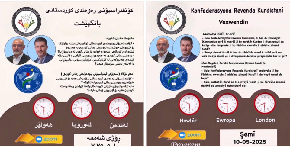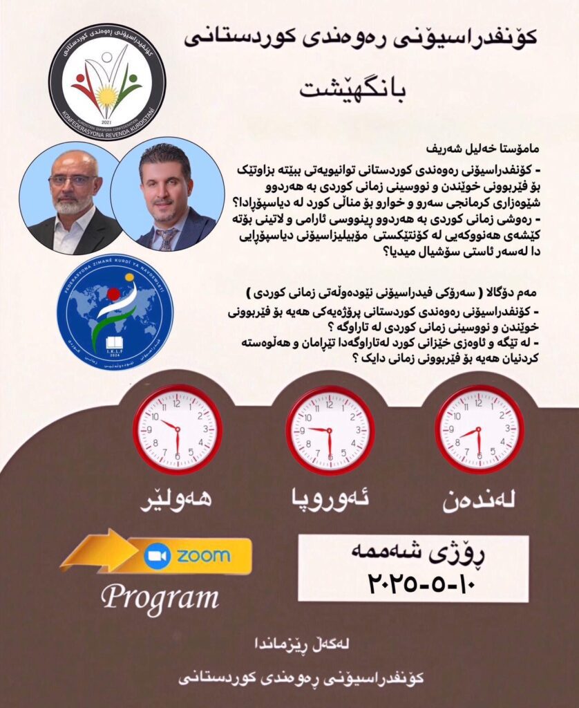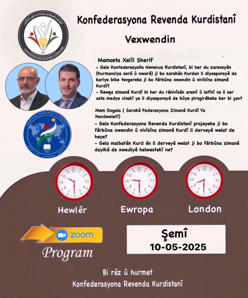 ئێوارەی ڕۆژی شەممە ڕێکەوتی ١٠ی٥ی٢٠٢٥، ئۆفیسی ڕاگەیاندنی کۆنفیدراسیۆنی ڕەوەندی کوردستانی، وێبنارێک بۆ بەڕێزان مامۆستا خەليل شەريف ،لە فيدراسيۆنى نێودەوڵەتى زمانى كوردى، مەم دۆگالا سەرۆكى فيدراسيونى نێودەوڵەتى زمانى كوردی، سازدەکەن.