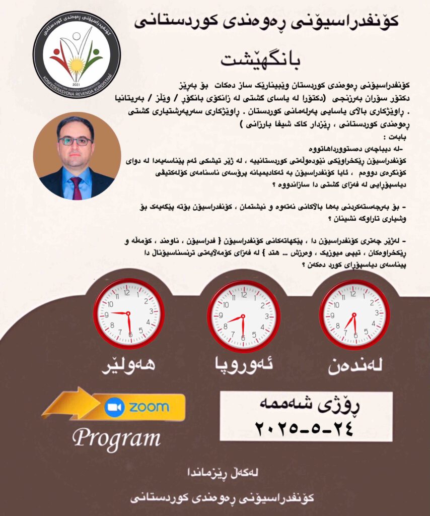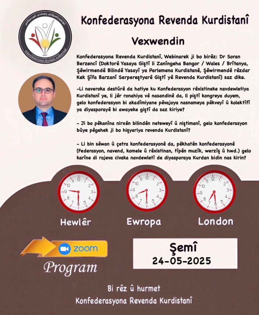 کۆنفیدراسیۆنی ڕەوەندی کوردستانی، بانگهێشتی تەواوی ئەندامانی دەکات، کە لە کاتی دیاریکراودا ئامادەی وێبناری دکتۆر سۆران بەرزنجی ڕاوێژکاری سەرپەرشتیاری گشتیی ڕەوەندی کوردستانی بن، کە بە شێوەی ئۆنلاین لە ڕێگای پرۆگرامی ZOOM و ئێوارەی ڕۆژی شەممە 2025.05.24 کاتژمێر 20:30 بە کاتی بەرلین ساز دەکرێت.