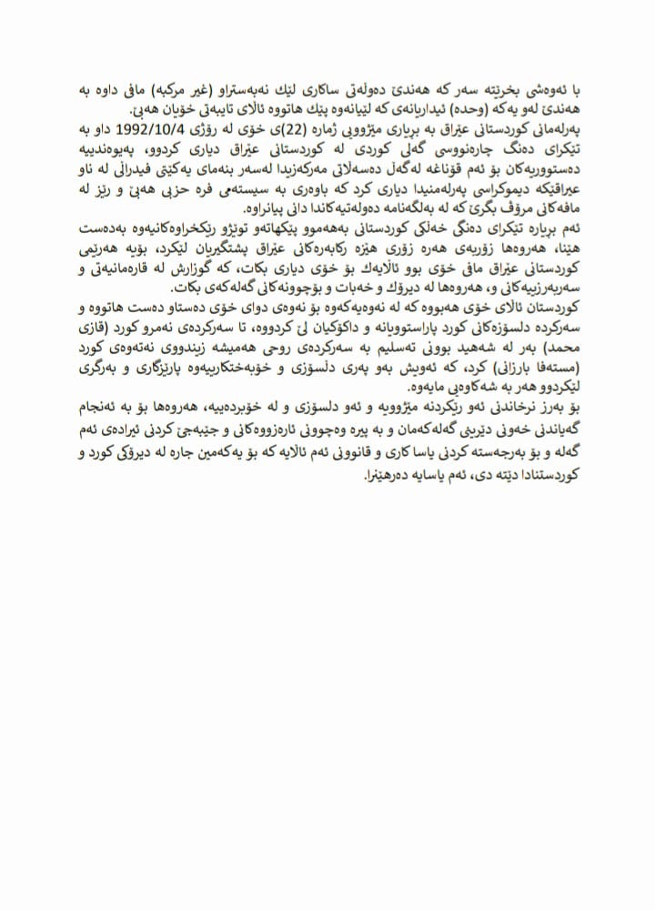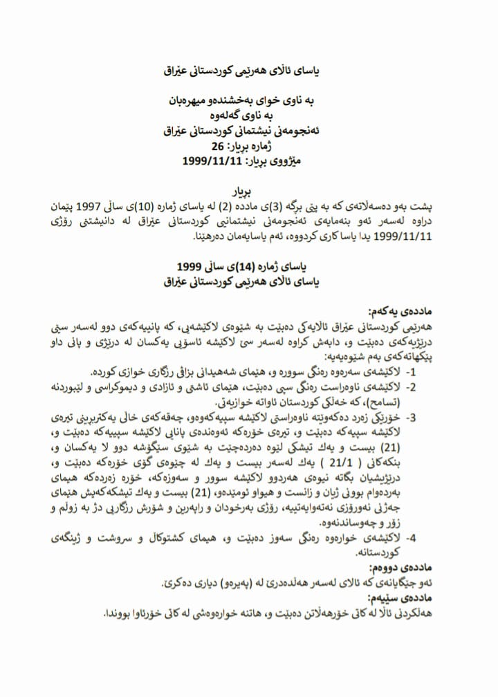 پشت به‌و ده‌سه‌ڵاته‌ی كه‌ به‌ پێی بڕگه‌ (٣)ی مادده‌ (٢) له‌ یاسی ژماره‌ (١٠)ی ساڵی ١٩٩٧ پێمان دراوه‌و له‌سه‌ر ئه‌و بنه‌مایه‌ی كه‌ ئه‌نجومه‌نی نیشتمانی كوردستانی عێراق له‌ دانیشتنی رۆژی ١١ی١١ی ١٩٩٩ یدا یاساكاری كردووه‌ ، ئه‌م یاسایه‌مان ده‌رهێنا:
