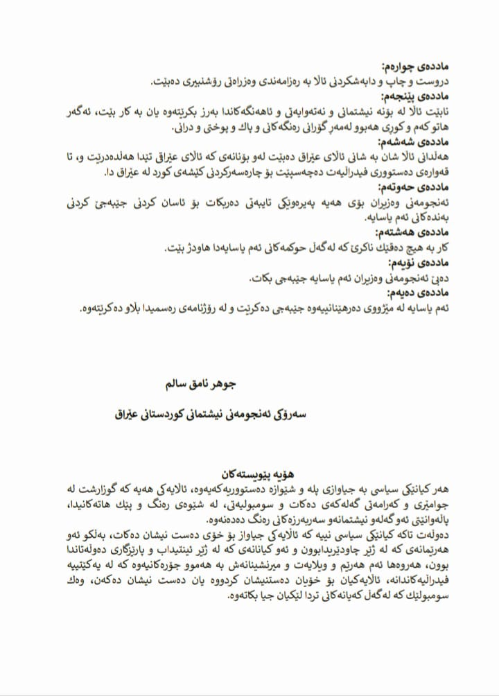 ٣- خۆرێكی زه‌رد ده‌كه‌وێته‌ ناوه‌راستی لاكێشه‌ سپییه‌كه‌وه‌و ، چه‌قه‌كه‌ی خاڵی یه‌كتر بڕینی تیره‌ی لاكێشه‌ سپیه‌كه‌ ده‌بێت و ، تیره‌ی خۆره‌كه‌ ئه‌وه‌نده‌ی پانایی لاكێشه‌ سپیه‌كه‌ ده‌بێت و ، (٢١) بیست و یه‌ك تیشكی لێوه‌ ده‌رده‌چێت به‌ شێوه‌ی سێگۆشه‌ی دوو لا یه‌كسان و ، بنكه‌كانی یه‌ك لەسه‌ر بیست و یه‌ك له‌ چێوه‌ی گۆی خۆره‌كه‌ ده‌بێت و ، درێژیشیان بگاته‌ نیوه‌ی هه‌ردوو لاكێشه‌ سوورو سه‌وزه‌كه‌ . خۆره‌ زه‌رده‌كه‌ هێمای به‌رده‌وام بوونی ژیان و زانست و هیوا و ئومێده‌و ، ( ٢١ ) بیست و یه‌ك تیشكه‌كه‌یش هێمای جه‌ژنی نه‌ورۆزی نه‌ته‌وایه‌تییه‌ ، ڕۆژی به‌رخودان و ڕاپه‌ڕین و شۆرش ڕزگاریی دژ به‌ زوڵم و زۆرو چه‌وساندنه‌وه‌.