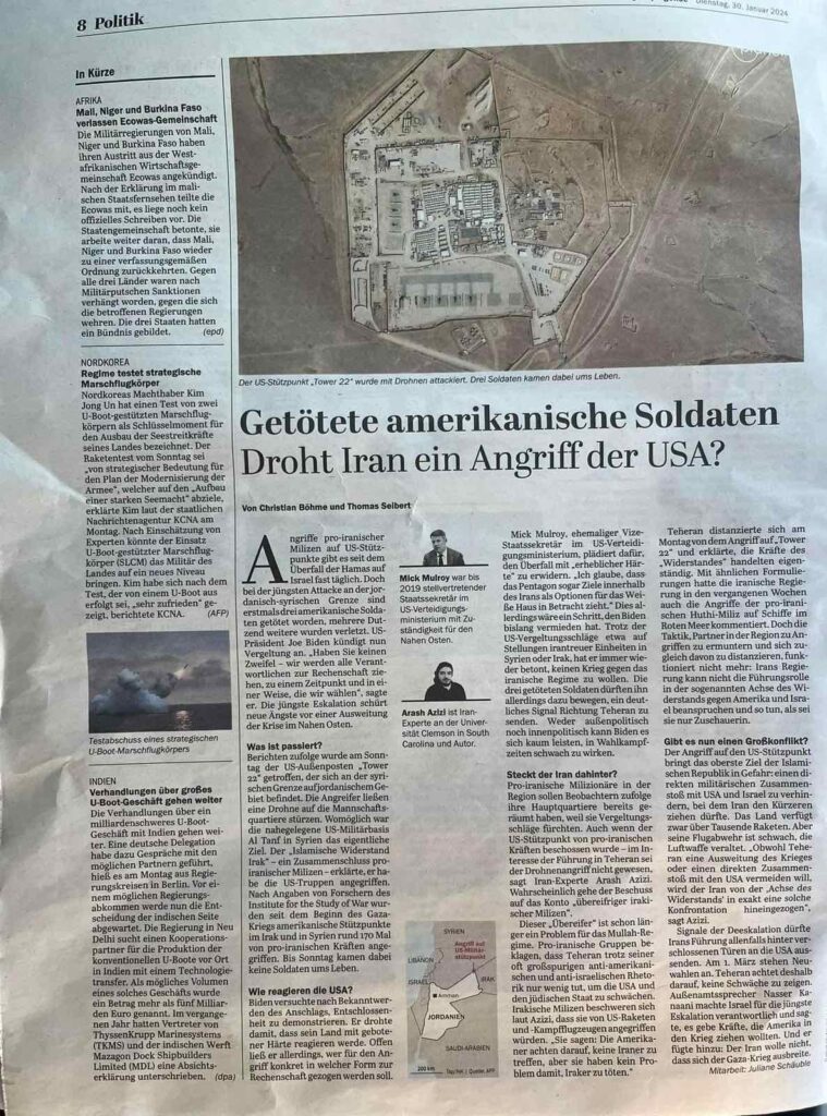 میلیشیا چەکدارەکانی سەر بە ئێران رۆژی یەکشەممە بە درۆن هێرشیان کەدە سەر بنکەیەکی ئەمەریکی لەسەر سنووری سووریا و ئەردەن و 3 سەربازی ئەمەریکی کوژران و نزیکەی 30 سەربازیش بریندار بوون..