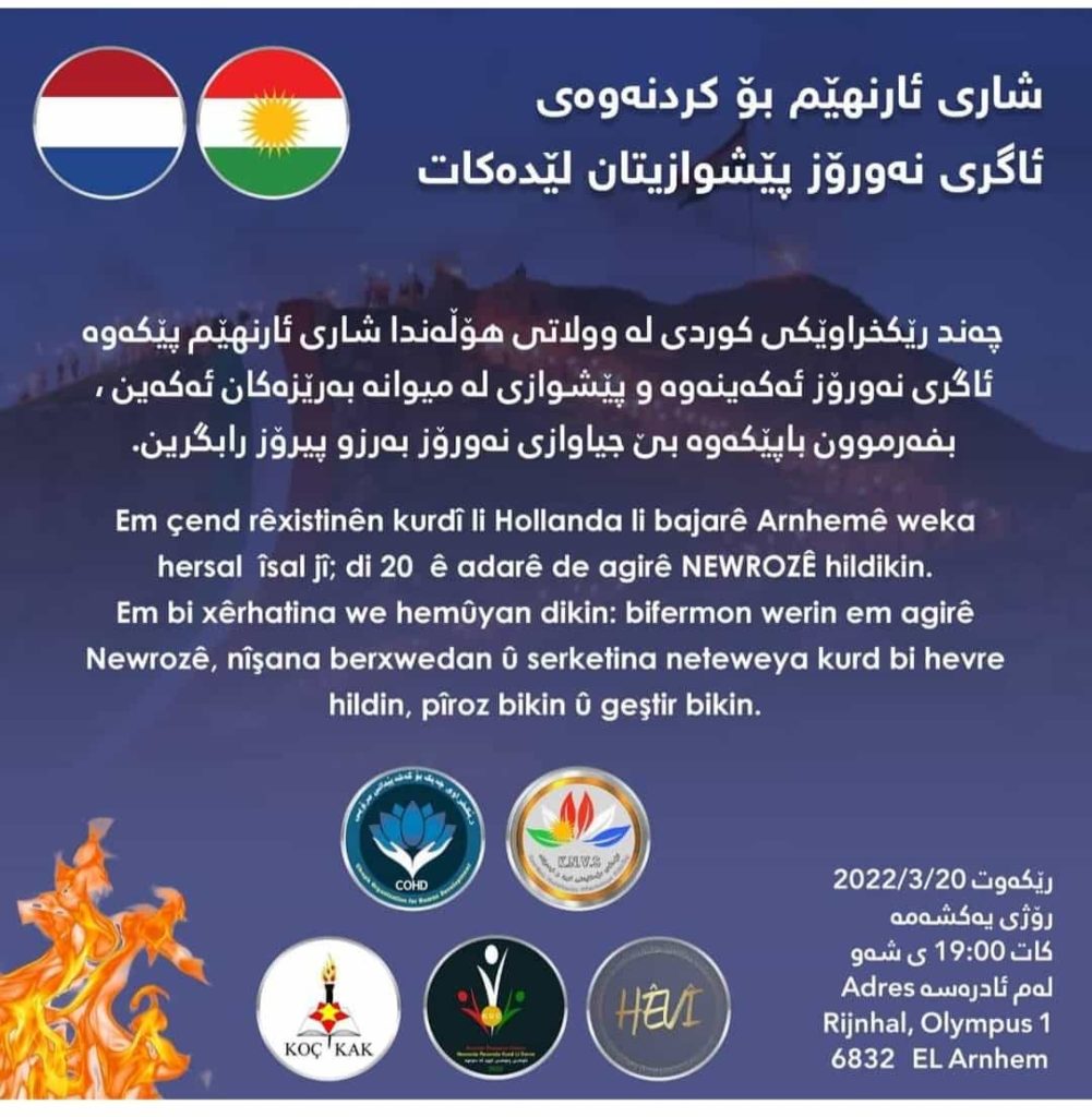 بە بۆنەی هاتنەوەی جەژنی پیرۆزی نەورۆزی سەری ساڵی کورد، پێنج ناوەند و رێکخراو و کۆمەڵەی کوردی، کە پێکهاتوون لە، ناوەندی ڕەوەندی کوردسانی لە نێدەرلاند، کۆمەڵەی دۆستایەتی کورد و نێدەرلاند، رێکخراوی چەپک، کۆمەڵەی کۆچکا، کۆمەڵەی هێڤی، لە شاری ئارنهێمی وڵاتی نێدەرلاند، هۆڵەندا، پێکەوە ئاگری نەورۆز دەکەنەوە و، داواش لە سەرجەم کوردانی نیشتەجێی ئەو وڵاتە دەکەن، کە لە پێناو بەرز و پیرۆز ڕاگرتنی جەژنەکە، لەو شوێنەی دیاری کراوە ئامادە بن.