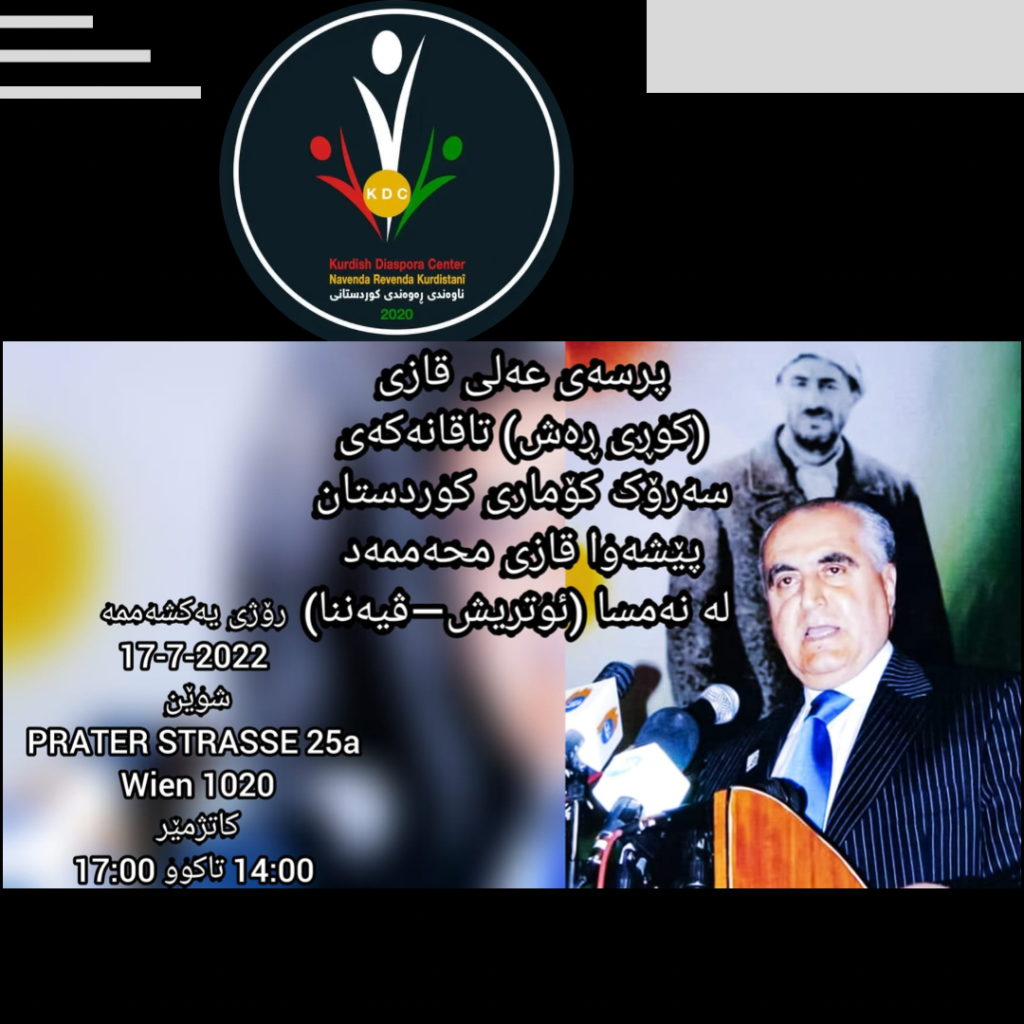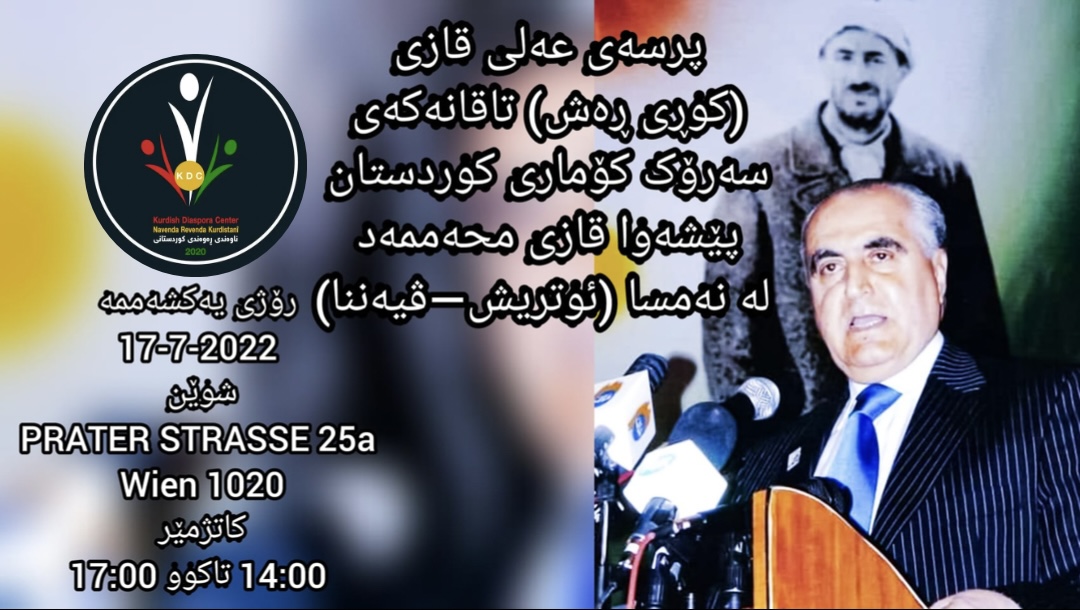 ناوەندی ڕەوەندی کوردستانی-نەمسا، وەک وەفایەک بۆ گیانی پاکی شەهید قازی محەمەد سەرۆکی کۆماری کوردستان، لە ڤیەننا رۆژی یەکشەممە لە کاتژمێر 14:00 تا 17:00 لەم prater strasse25a پرسە بۆ کۆچی دوایی عەلی قازی کوڕی دادەنێن.