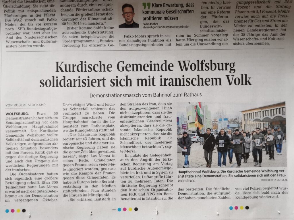 ناوەندی ڕەوەندی کوردستانی-ڤۆلفسبورگ، رێپێوانێکیان بەمەبەستی پشتگیریکردنی خۆپیشاندەرانی کوردانی رۆژهەڵات و ئێران بە ئامادەبوونی ژمارەیەکی بەرچاو لە کوردانی هەر چوار پارچەی کوردستان سازدا، کە تێیدا وتاری رێکخەر و لایەن و چالاکوانی خوێندرانەوە و لە رۆژنامەی شارەکەش، وەک هەواڵێکی گرینگ بڵاوکرایەوە.