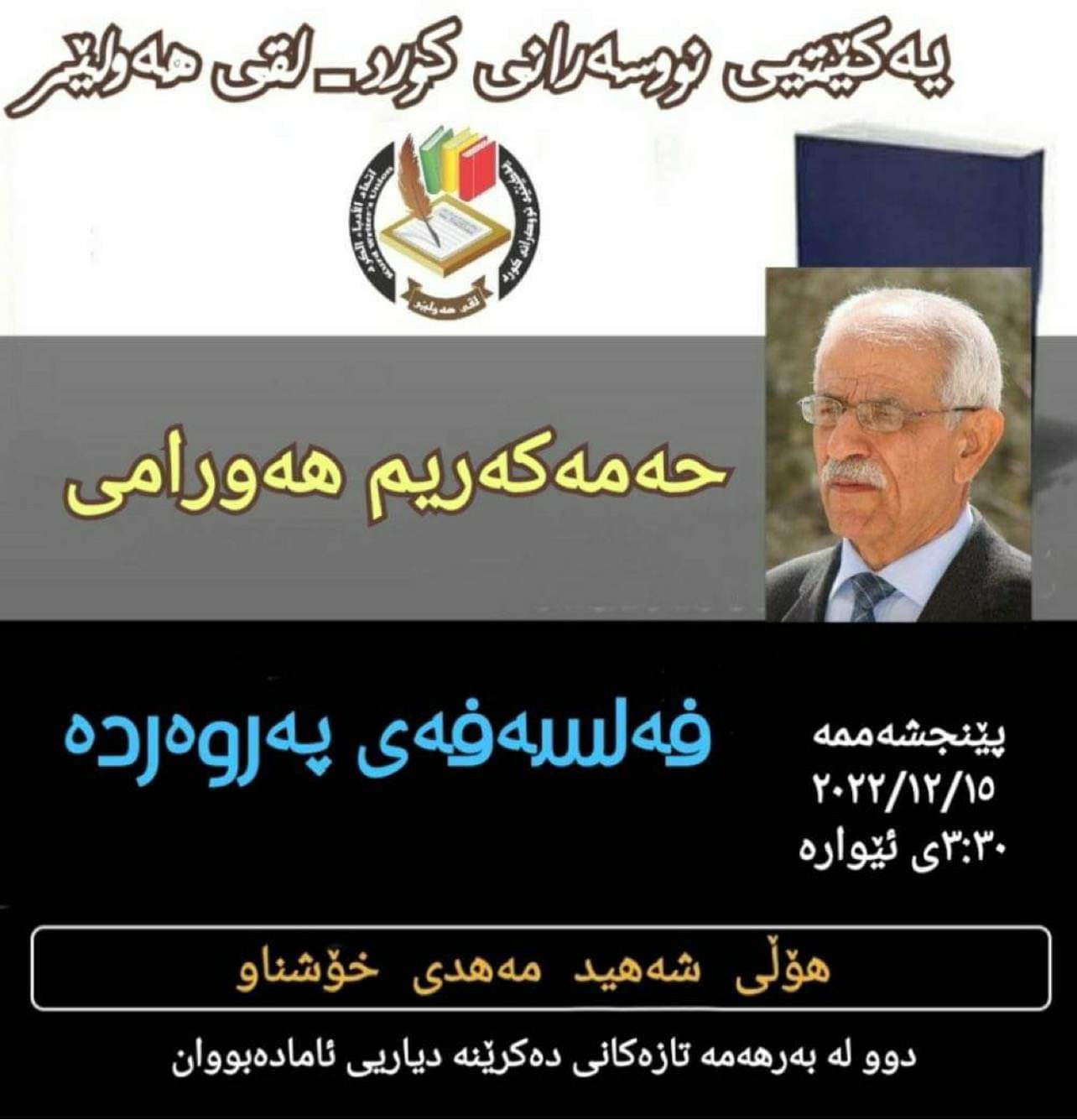 نوێنەری کۆنفدراسیۆن وناوەندی ڕەوەندی کوردستان لە هەرێمی کوردستان بەبانگهێشتی تایبەتی لقی هەولێری یەکێتی نوسەرانی کورد بەشداری کۆڕی نوسەر و ڕۆشنبیر کورد مامۆستا حەمەکەریم هەورامی دەکات