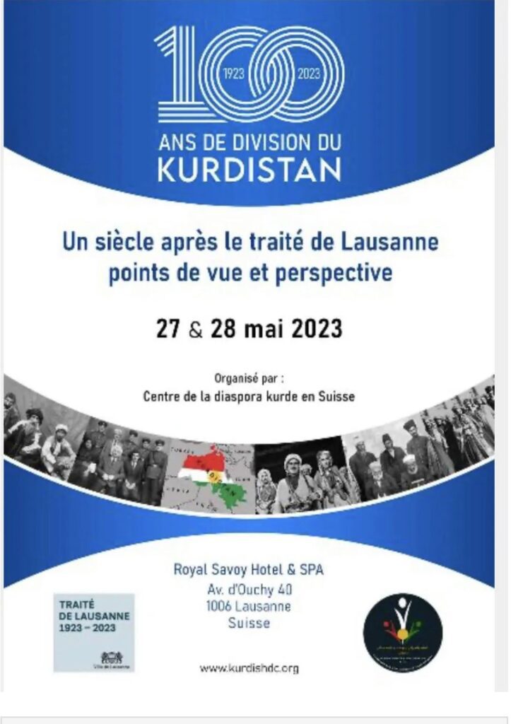 ڕۆژی شەممە ڕێککەوتی 2023.05.27کاتژمێر 10ی سەر لە بەیانی، ناوەندی ڕەوەندی کوردستانی-سویسرا، بە سەرپەرشتی کۆنفدراسیۆنی ڕەوەندی کوردستانی و، هەماهەنگی شارەوانی لۆزان، کۆنفرانسێکی تایبەت لەسەر رێککەوتننامەی لۆزان، بەڕێوەدەبەن، سەرەتا وتاری کۆنفدراسیۆنی ڕەوەندی کوردستانی پێشکەشکرا، دواتریش وتاری سەرۆک مەسعود بارزانی لەلایەن شیفا بارزانی سەرپەرشتیکاری گشتی ڕەوەندی کوردستانییەوە خوێندرایەوە، پاشان وتاری شارەوانی لۆزان پێشکەشکرا.