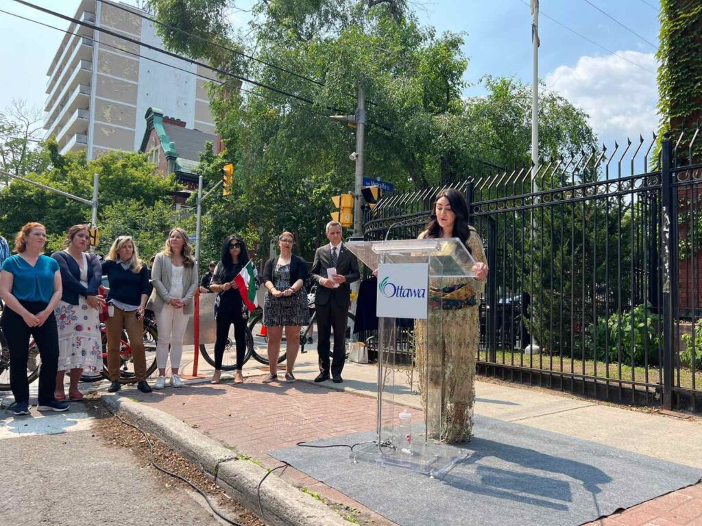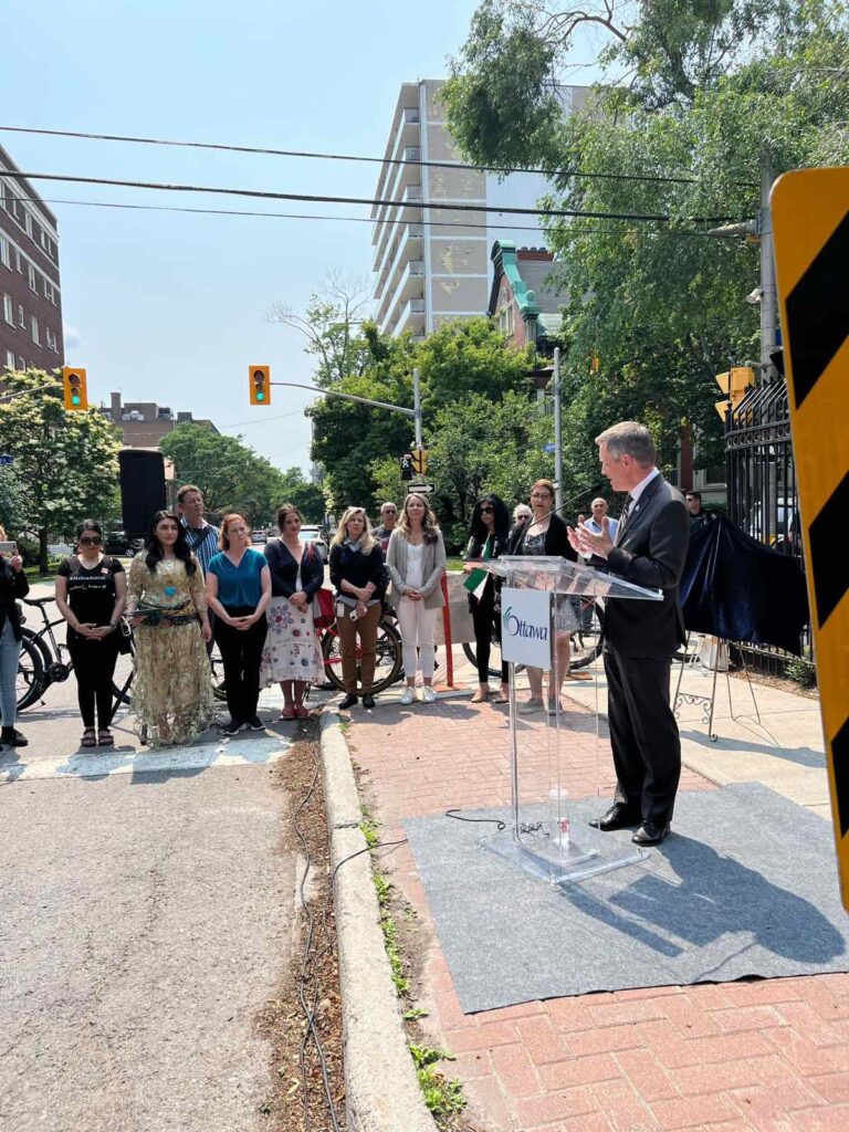 رۆژی سێشەممە، رێککەوتی۲٠/٦/۲٠۲۳ ناوەندی ڕەوەندی کوردستانی-ئۆتاوا، لەگەڵ سەرۆکی شارەوانی ئۆتاوا و، چەند راوێژکارێک و کەسایەتی حکومی و ئەندام پەرلەمانێکی کەنەدا و، چەندین کەسایەتی دیاری کوردی وەک، شەهرام دۆستی، بەشدارییان لە رێوڕەسمى پەردەلادان و ناونانى شەقامێكى سەرەكى ناوجەرگەى شارى ئۆتاوایان به ناوى ژينا ئەمینی (مه هسا)وە کرد، کە کەوتووەتە سەر ئەو شەقامەی باڵیۆزخانەى رژێمى ئێرانى لێيه.