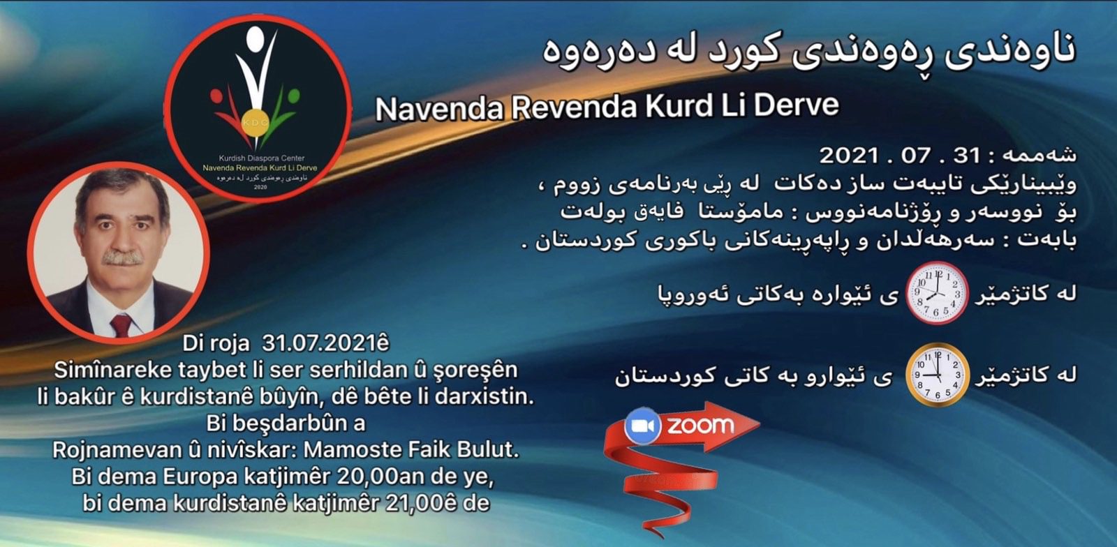 وێبینارێکی تایبەت 2021-07-272021-07-27149 ناوەندی ڕەوەندی کورد لە دەرەوەلە 31 . 07 . 2021سمینارێکی تایبەت لەسەر سەرهەڵدان و ڕاپەڕینەکانی باکوری کوردستان بەڕێوە دەچێت.به به شداریڕۆژنامەنووس و نووسەر : مامۆستا فایەق بولەت .لەکاتژمێر 20.00 بەکاتی ئەوروپاکاتژمێر 21:00 بەکاتی ھەولێر