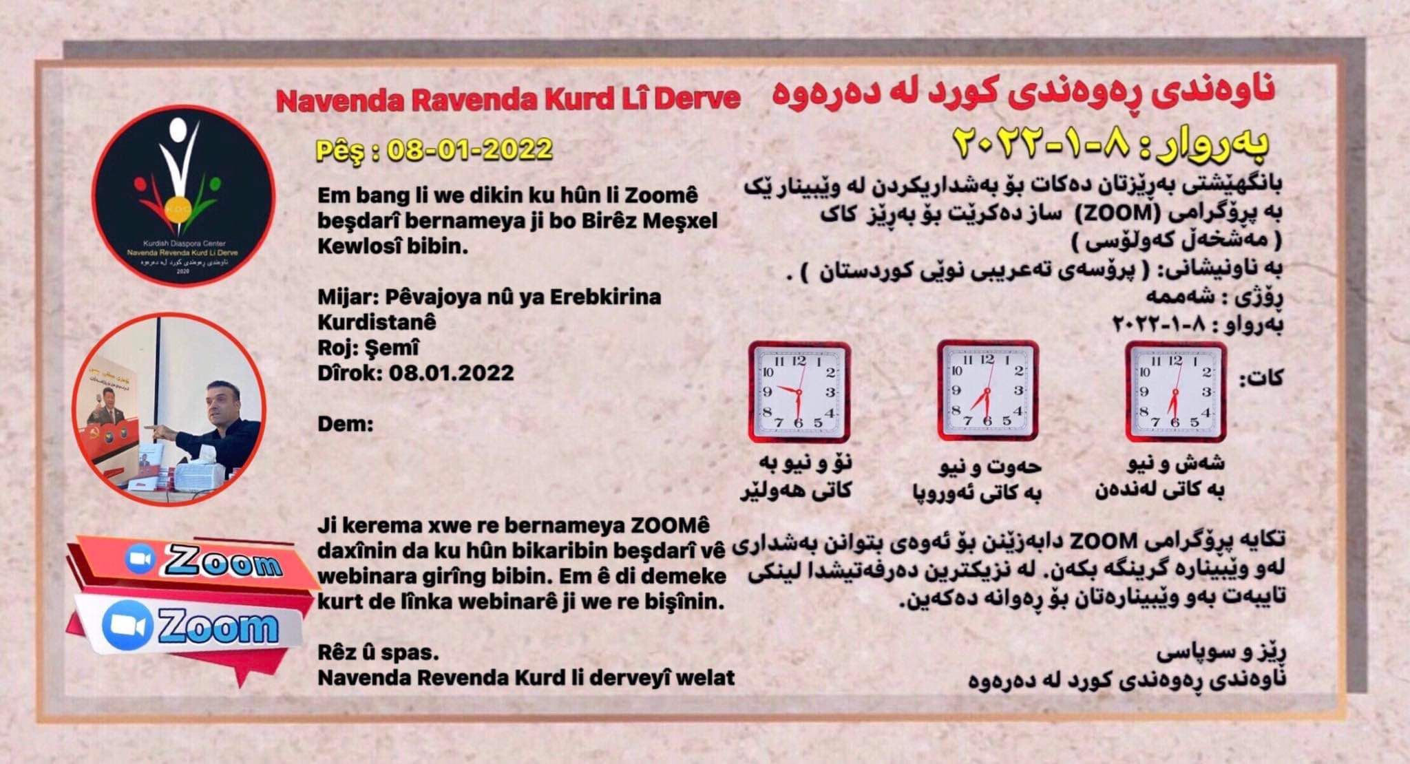 تکایە پڕۆگرامی ZOOM دابەزێنن بۆ ئەوەی بتوانن بەشداری لەو وێبینارە گرینگە بکەن. لە نزیکترین دەرفەتیشدا لینکی تایبەت بەو وێبینارەتان بۆ ڕەوانە دەکەین.