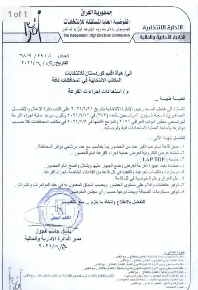 کۆمسیۆنی باڵای سەربەخۆی ھەڵبژاردنەکانی عێراق لە نووسراوێكدا، كە ئاڕاستەی وەزارەتی خوێندنی باڵای فیدڕاڵی كردووە، ئاماژەی بەوەكردووە، “لە مانگی 10ی ئەمساڵدا هەڵبژاردنی پەڕلەمانی عێراق ئەنجام دەدرێت و لە ئێستاشدا نزیكبوونەتەوە لە دیاری كردنی كارمەندانی سەر سندوقەكانی دەنگدان، بۆیە بەپێی بڕیاری ئەنجوومەنی وەزیران داواتان لێ دەكەین ناوی مامۆستایانی زانكۆ ڕەوانە بكەن بۆمان بەپێی فۆڕمێكی ئەلیكترۆنی، كە بۆتان ڕەوانە دەكەین”.