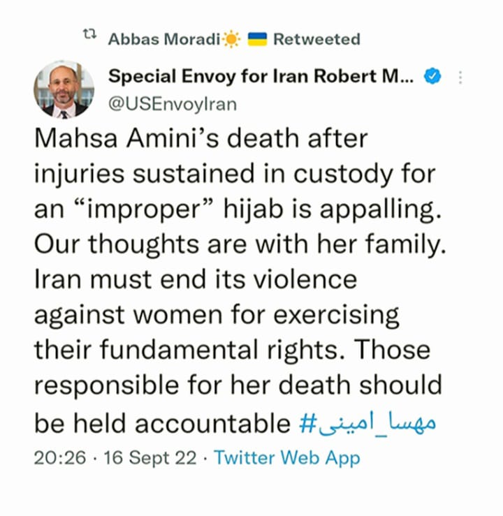 رۆبێرت مالی، نوێنەری تایبەتی ئەمریکا بۆ ئێران له‌ هەژماری تایبەتی خۆی لەتویتەر لە تویتێكدا سه‌ركۆنه‌ی کوشتنی ژینا ئەمینی ، کچە کوردەکەی شاری سەقزی رۆژهه‌ڵاتی كوردستان ده‌كات.