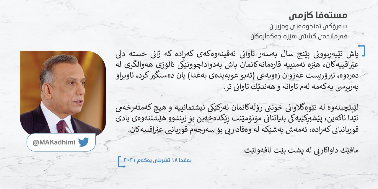 مستەفا کازمى، لە تویتێکدا نووسیویەتی: پاش تێپەڕبوونی پێنج ساڵ بەسەر تاوانی تەقینەوەكەی كەڕادە، كە ژانی خستە دڵی عێراقییەكان، هێزە ئەمنییە قارەمانەكانمان پاش بەدواداچوونێكی ئاڵۆزی هەواڵگری لە دەرەوە، تیرۆریست غەزوان زەوبەعی (ئەبو عوبەیدەی بەغدا)یان دەستگیر كرد، ناوبراو بەرپرسی یەكەمە لەم تاوانە و هەندێك تاوانی دیکە.