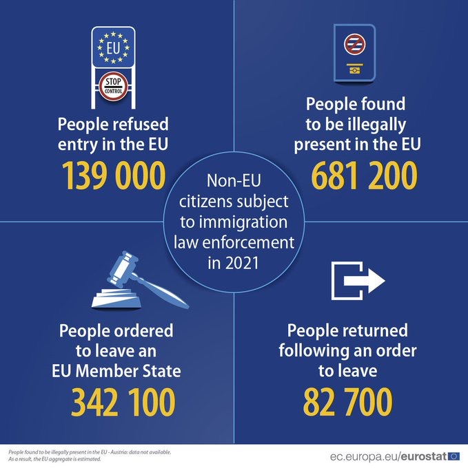 لە راپۆرتەکەدا هاتووە، ساڵی 2021، زیاتر لە 680,000 کۆچبەر، بە نایاسایی لە وڵاتانی یەکێتی ئەوروپا دەژین، کە ژمارەیان 22٪ زیاترە لە ساڵی 2020.