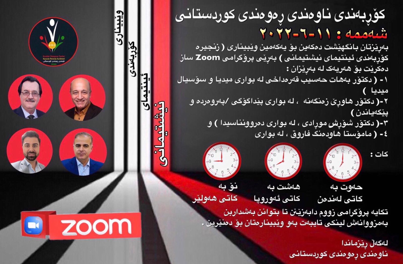 ڕۆژی شەممە، رێککەوتی 11.06.2022، ڕاگەیاندنی کۆنفدراسیۆن و ناوەندی ڕەوەندی کوردستانی، یەکەم کۆڕبەندی ئینتیمای نیشتمانی لە ڕێی ئۆنلاین بە پرۆگرامی ZOOM سازدەکەن.