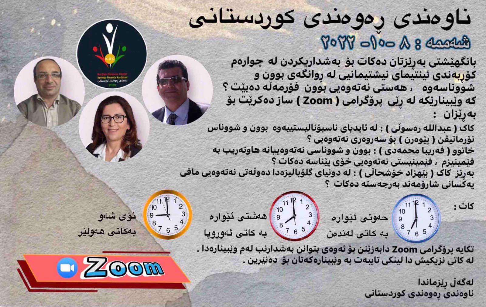 ناوەندی ڕەوەندی کوردستانی، چوارەم کۆڕبەندی ئینتیمای نیشتیمانی لەڕێی بەرنامەی zoomەوە ساز دەکات، هاوکات داواش لە ئەندامانی دەکات، لە کاتی دیاریکراودا بەشدار بن.