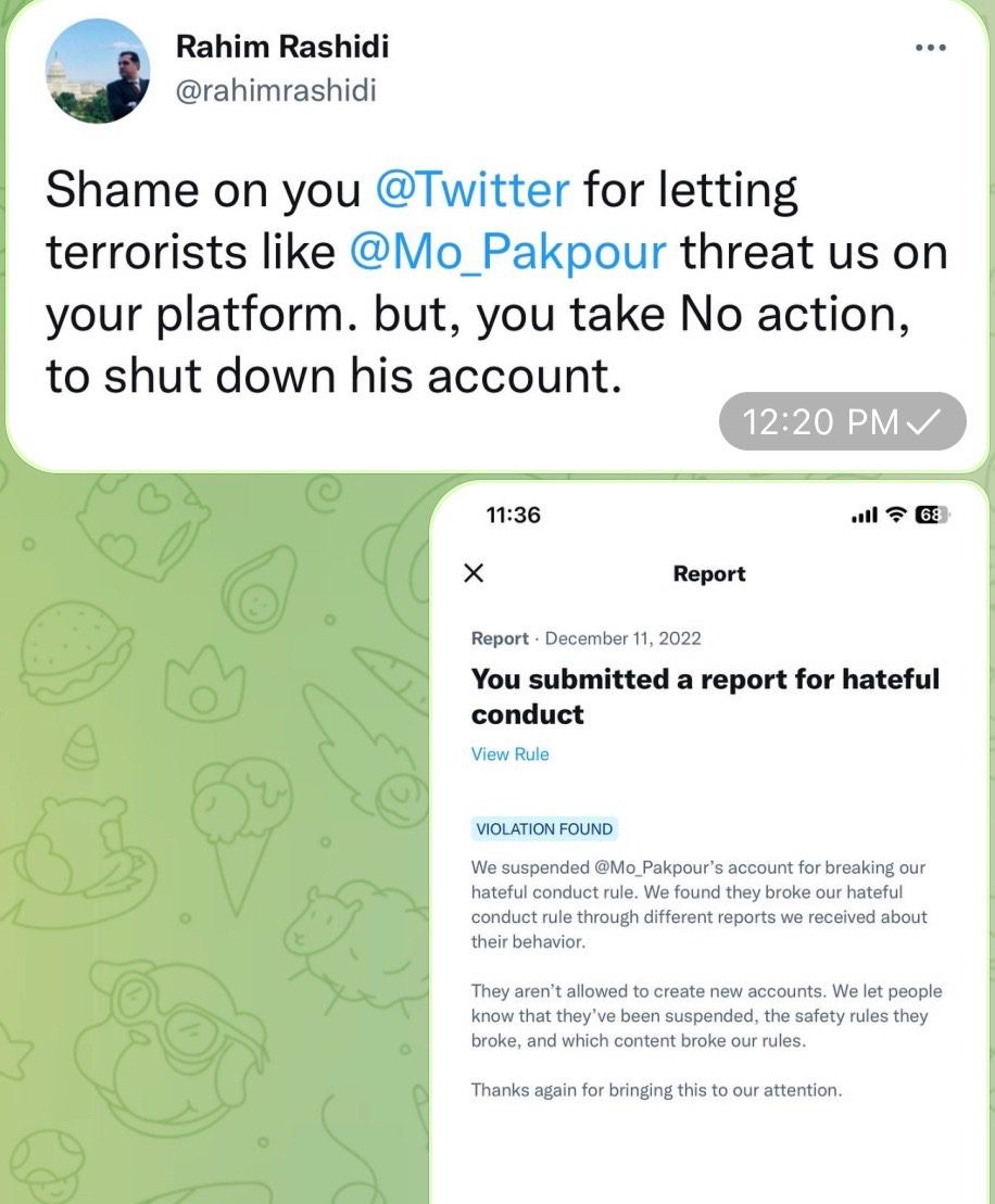 دواتر رۆژنامەوان رەحیم رەشیدی سەبارەت بە هەڕەشەی ئەو تیرۆریستە، کاردانەوەی خۆی نیشانداو لە پەیامێکدا بۆ بەڕێوەبەرانی تویتەر نووسی: ”شەرمەزارییە بۆ تویتەر، تیرۆریستێکی وەک موحەممەد پاکپوور، لە تۆڕەکەی ئێوەوە هەڕەشەمان لێبکات، ئێوەش هیچ کاردانەوەیەکتان نییە و هەژمارەکەی داناخەن.”