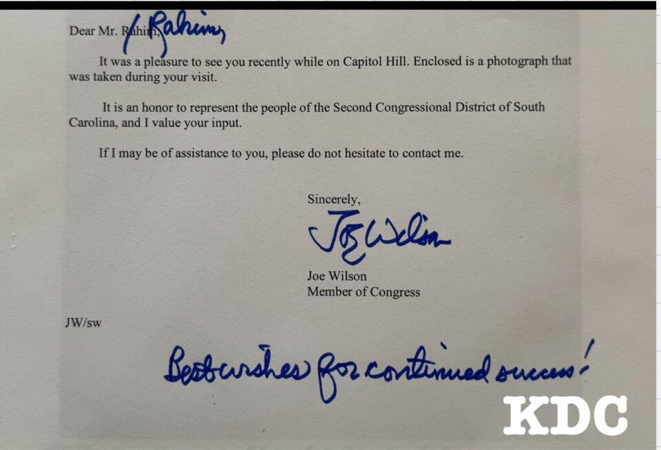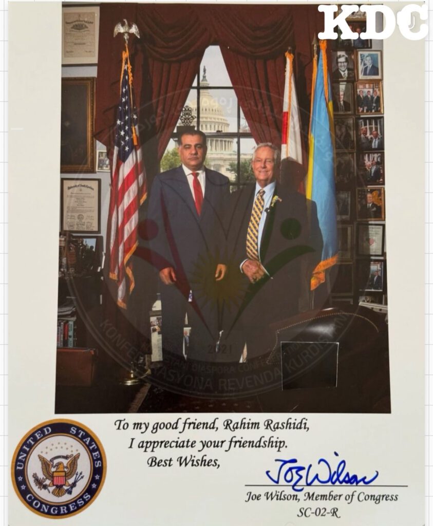 كەسایەتی دیار و ئەندامی كۆنگرێس جۆو ویلسۆن، کە کەسێکی نزیکی دۆناڵد ترەمپ سەرۆکی ئەمریکایە، وێنەیەکی خۆی و بەرپرسی ئۆفیسی پەیوەندییەكانی كۆنفیدراسیۆنی ڕەوەندی کوردستانی واژۆ كردووە و لەسەر وێنەکە نووسیویەتی: ”هاوڕێی ئازیزم رەحیم رەشیدی، سوپاسی دۆستایەتیتان دەکەم”.