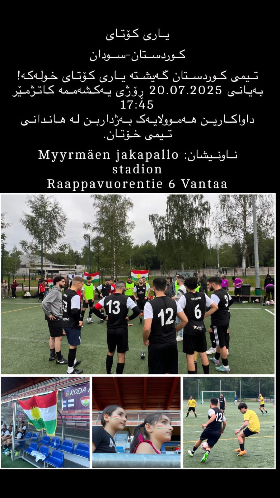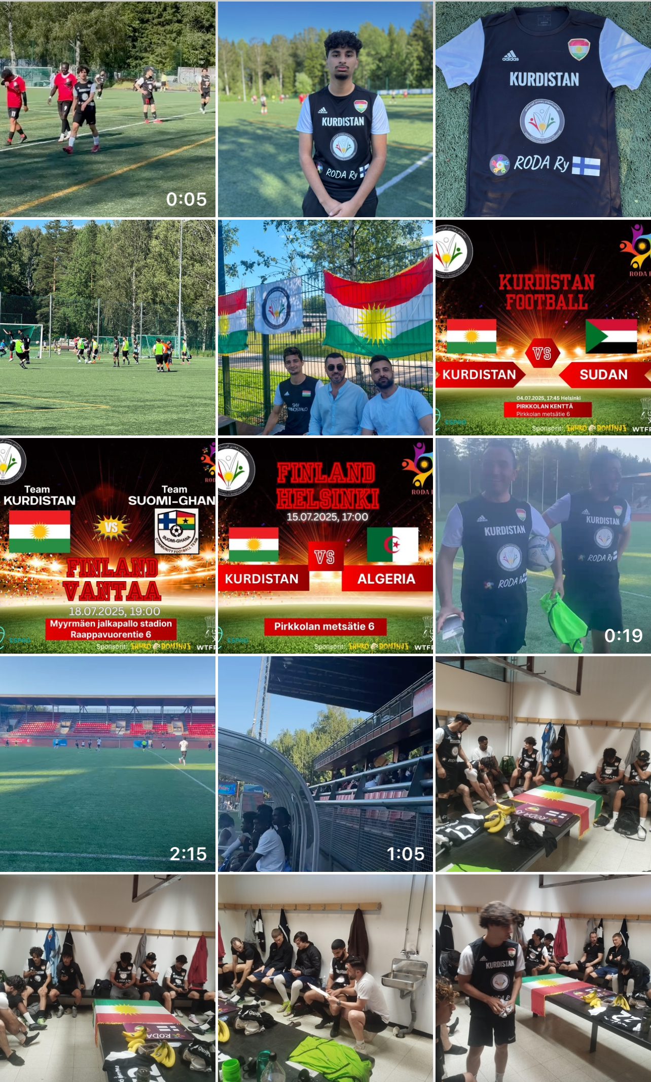 ناوەندی رەوەندی کوردستانی-فینلەندا و رێکخراوی roda ryی کوردی، کە لە کوردانی رۆژئاوا پێکهاتوون و ئەندامی ناوەندەکەن، پێکەوە تیپێکی تۆپی پێی لاوانی کوردیان بە ناوی کوردستان دامەزراندووە، کە لە سەدا نەوەدی یارییزانەکانیان لە کوردانی هەر چوار پارچەی کوردستان پێک هاتوون، هاوکات سوودیشیان لە لاوی فینلەندی وەرگرتووە.