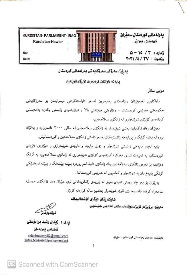 ئەو ئەندامەی پەرلەمان ئاماژەی بەوەشدا، کە پێشنیارەكەیان لەلایەن وەزیری خوێندنی باڵا و بریكار و سەرۆكی زانكۆی سەڵاحەدین و ئەنجوومەن و سەرۆك بەش و، كۆلیژی ئادابی زانكۆكە قبوڵ كراوە و، لە داهاتوویەكی نزیكدا كۆلیژی شوێنەوار لە زانكۆی سەڵاحەدین دەكرێتەوە و كارەكانی دەكەوێتە بواری جێبەجێ كردن.