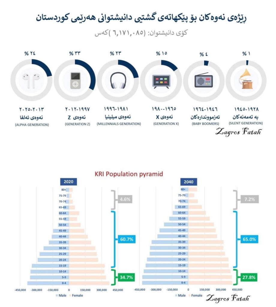 ئەوەی من مەبەستمە لەم نووسینەدا زیاتر تیشكی بخەمە سەر، بریتییە لە بەشداریپێكردن و گرنگیدان بەو گرووپەی نەوەكان كە بەنەوەی (میلینیا) ناسراوە کە لەدایکبووی نێوان (١٩٨١ – ١٩٩٦)ـن، بە پێی داتای دانیشتوانی ساڵی ٢٠٢٠، كە لەلای حكوومەتی هەرێمی كوردستان و وەزارەتەكانی بەردەستە، نەوەی میلینیا رێژەی ٢٣٪ـی دانیشتوانی هەرێمی کوردستان پێک دەهێنن، ئەمە لە کاتێکدایە کە نزیكەی (٨٠%)ـی دانیشتوانی هەرێمی كوردستان تەمەنیان كەمترە لە (٤٢ ساڵ)، ئەمە دەرخەری ئەو راستیەیە كە گەنجان، گەورەترین گرووپی تەمەنن لە پێكهاتەی دانیشتوانی هەرێمی كوردستاندا، هاوکات ئەگەر تەماشای پێکهاتەی دیمۆگرافی دانیشتوانی هەرێمی کوردستان بکەین، ئەوە دەردەکەوێت کە پێکهاتەیەکی هەرەمییە و تا ساڵی ٢٠٤٠ـیش بەم شێوە هەرەمییە دەمێنێتەوە کە رێژەی گەنجان تێیدا گەورەترین رێژەی توێژە جیاوازەکانی دانیشتوانی هەرێمی کوردستانە.