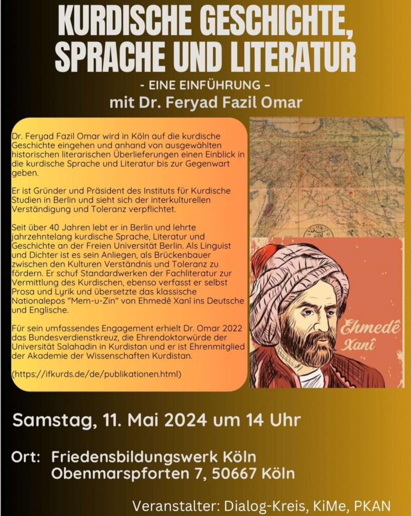 کاتژمێر دووی دوانیوەڕۆی ڕۆژی شەممە، ڕێکەوتی ١١-٥-٢٠٢٤، ناوەندی وتووێژ لە شاری کۆڵنی ئەڵمانیا، کۆڕێک بۆ دکتۆر فەریاد فازیل عومەر دەگێڕێ. ناوبراو لەو کۆڕەدا توێژینەوەیەک دەربارەی بنچینە پشت پێ بەستراوەکانی مێژوو، زمان و ئەدەبی کوردی پێشکەش دەکات.
