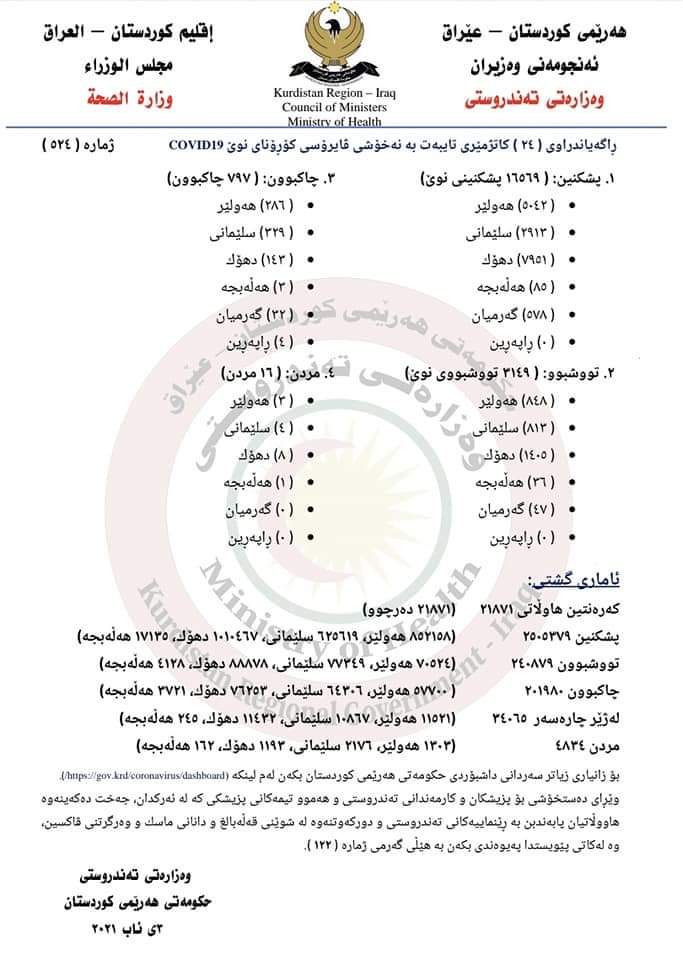بۆ زانیاری زیاتر سەردانی داشبۆردی حکومەتی هەرێمی کوردستان بکەن لەم لینکە (https://gov.krd/coronavirus/dashboard/).