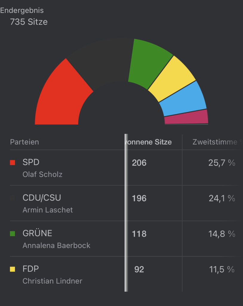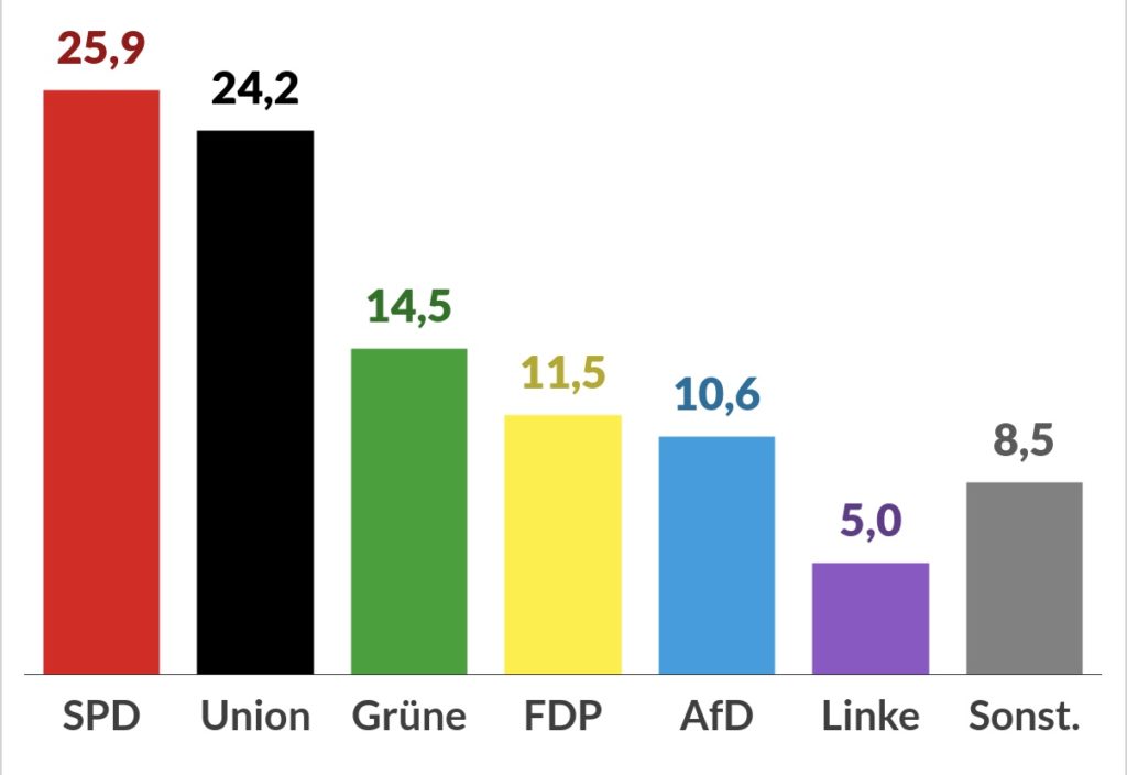 هەڵبژاردنەکانی ئەڵمانیا کۆتایی پێهات و، حیزبی سۆشیال دیموکرات بە کۆکردنەوەی 25.8 % ی دەنگەکان سەرکەوتنی بە دەستهێنا، حیزبەکەی ئانگێلا مێرکڵ، یەکێتی کریستیان دیموکرات و یەکێتی سۆشیال کریستیان پێکەوە بەشدار بوون لە هەڵبژاردنەکاندا و 24.1 % ی دەنگەکانیان بە دەستهێنا، حیزبی سەوزیش 14.6 % و حیزبی لیبڕاڵی دیموکراتی ئازادیش 11.5 % ی دەنگەکانی بە دەستهێنا.