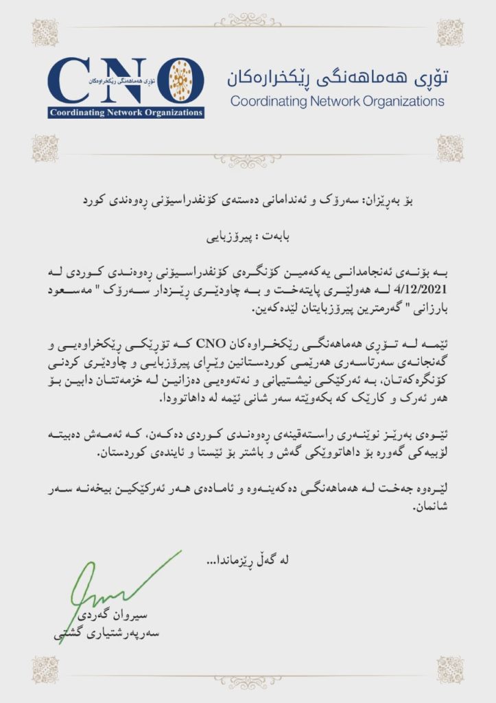 سەرپەرشتیاری گشتی تۆڕی هەماهەنی ڕێکخراوەکان، پیرۆزبایی خۆیان ئاڕاستەی ناوەندی ڕەوەندی کورد دەکەن، کە یەکەمین کۆنگرەی خۆی لە ژێر چاودێری سەرۆک مەسعود بارزانی لە هەولێری پایتەختی هەرێمی کوردستان ئەنجام دا، هاوکات ئەنجامدانی کۆنگرەکەش بە ئەرکێکی نەتەوەیی و نیشتیمانی وێنا دەکەن.