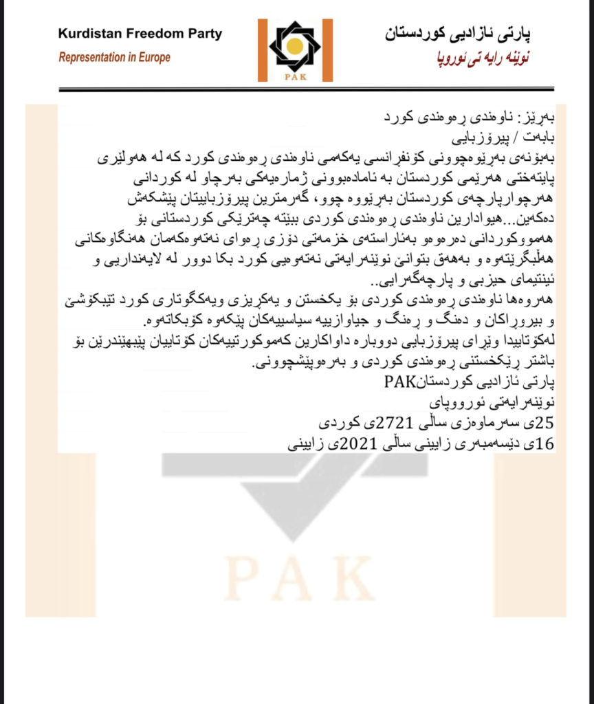 نوێنەرایەتی ئەوروپای پارتی ئازادی کوردستان، بە بۆنەی بەستنی یەکەمین کۆنگرەی ناوەندی ڕەوەندی کورد لە هەولێری پایتەختی هەرێمی کوردستان، پیرۆزبایی خۆیان ئاڕاستەی ناوەندەکە دەکەن و هیواخوازن، کە ناوەندەکە ببێتە چەترێکی کوردستانی بۆ هەموو کورددانی دەرەوە بە ئاڕاستەی خزمەتکردنی دۆزی رەوای کورد.