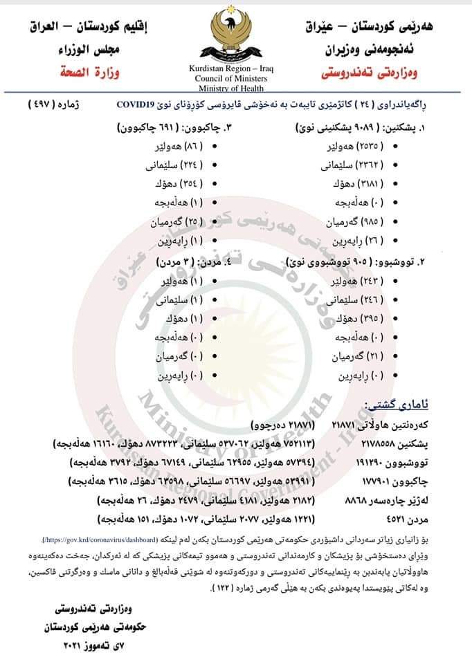 وەزارەتی تەندروستی هەرێمی كوردستان، ئاماری 24 كاتژمێری رابردووی پەتای كۆڕۆنای بڵاوكردەوەو بەگوێرەی راگەیەندراوێكیش، ژمارەی تووشبوون و گیانلەدەستدان بەراورد بە دوێنێ كەمبووەتەوەو نزیكەی 670 تووشبووش چاكبوونەتەوە.