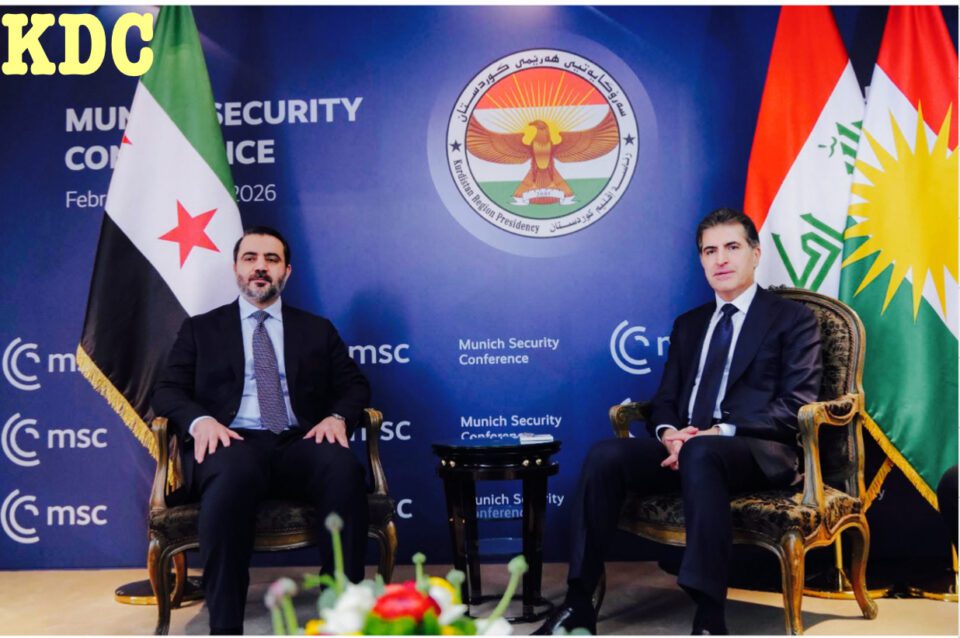 Piştî nîvroya îro Şemî, 14.02.2026, li çarçêweya karên Konferansa Ewlekariyê ya Munihê de, Nêçîrvan Barzanî, Serokê Herêma Kurdistanê û Es’ed El-Şeybanî, Wezîrê Derve yê Sûriyeyê, civiyan.