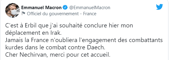 Serokê Fransayê Emanuel Macron li ser hesabê xwe yê Twitterê li ser serdana xwe ya Kurdistanê wiha nivîsand: “Fransa tu carî pabendiya şervanên Kurd bi şerê li dijî DAIŞê ji bîr nake. Min xwest ez doh li Hewlêrê serdana xwe ya Iraqê bi dawî bikim. Nêçîrvanê hêja, spas ji bo vê pêşwaziyê.”